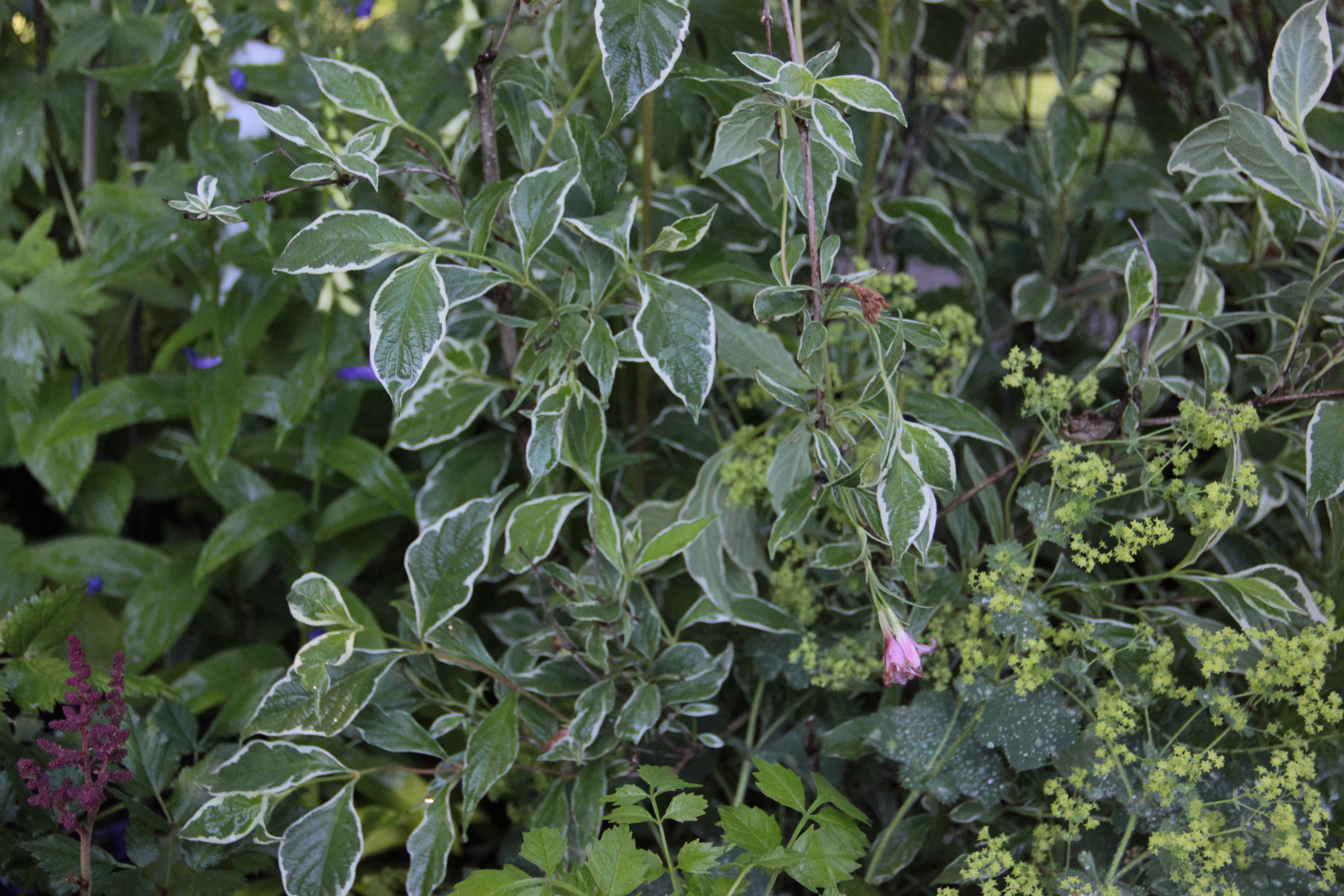 I’ve identified what I think are a few weigela at Coppertop: a variegated in the perennial beds alongside lady’s mantle and astilbe, one pale pink near the trio of birdhouses, and one possibility with red-tinged leaves and yellow blooms outside the ground floor of our home.