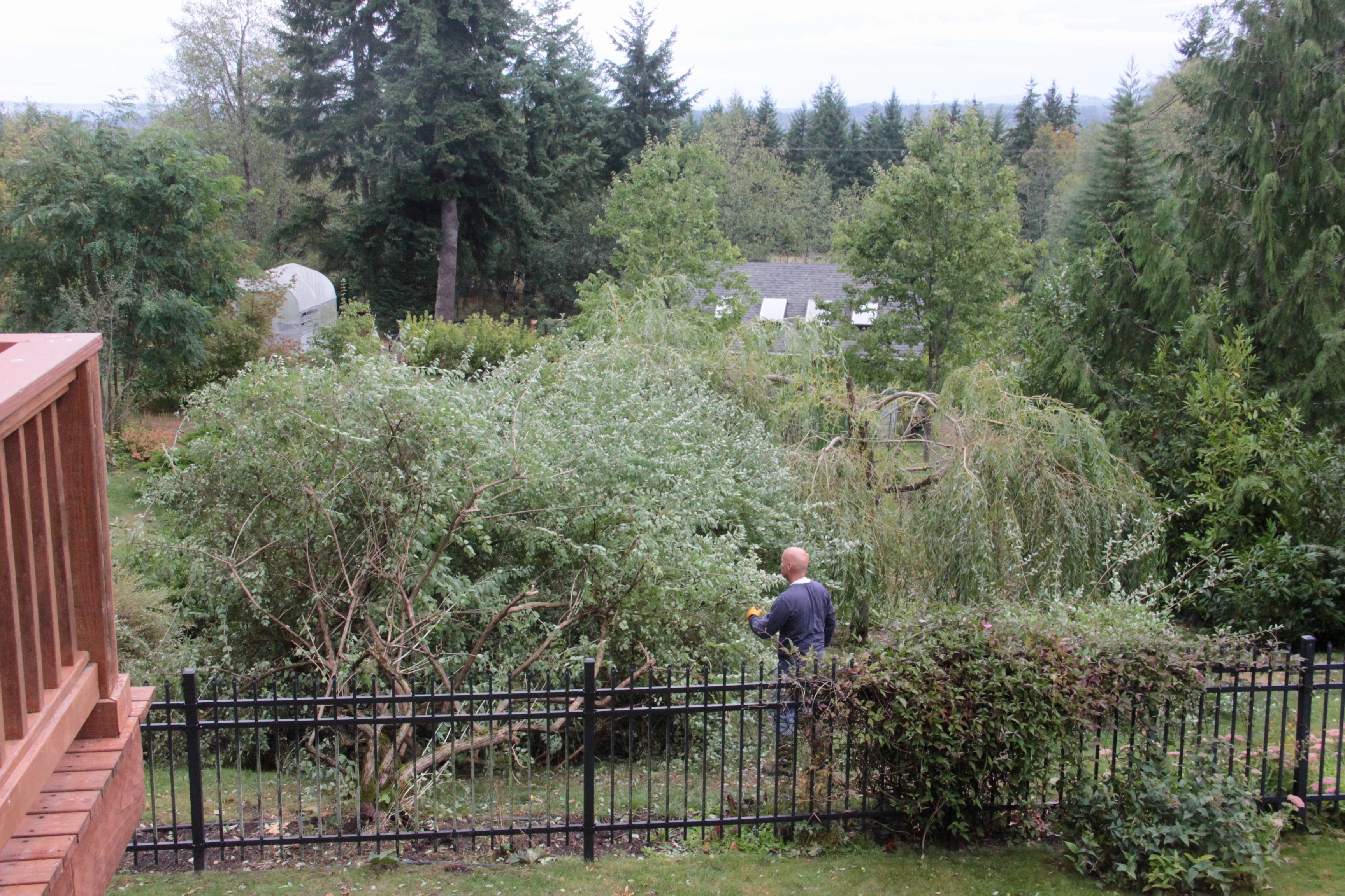 - Hired Hart’s Tree Service to do lots of tree removal and clean up. Took out two more large alders along the stream, removed many limbs on other trees, helped with storm cleanup, and shredded it all. We now have a few more cords of firewood to split, plus enormous piles of mulch. mid September