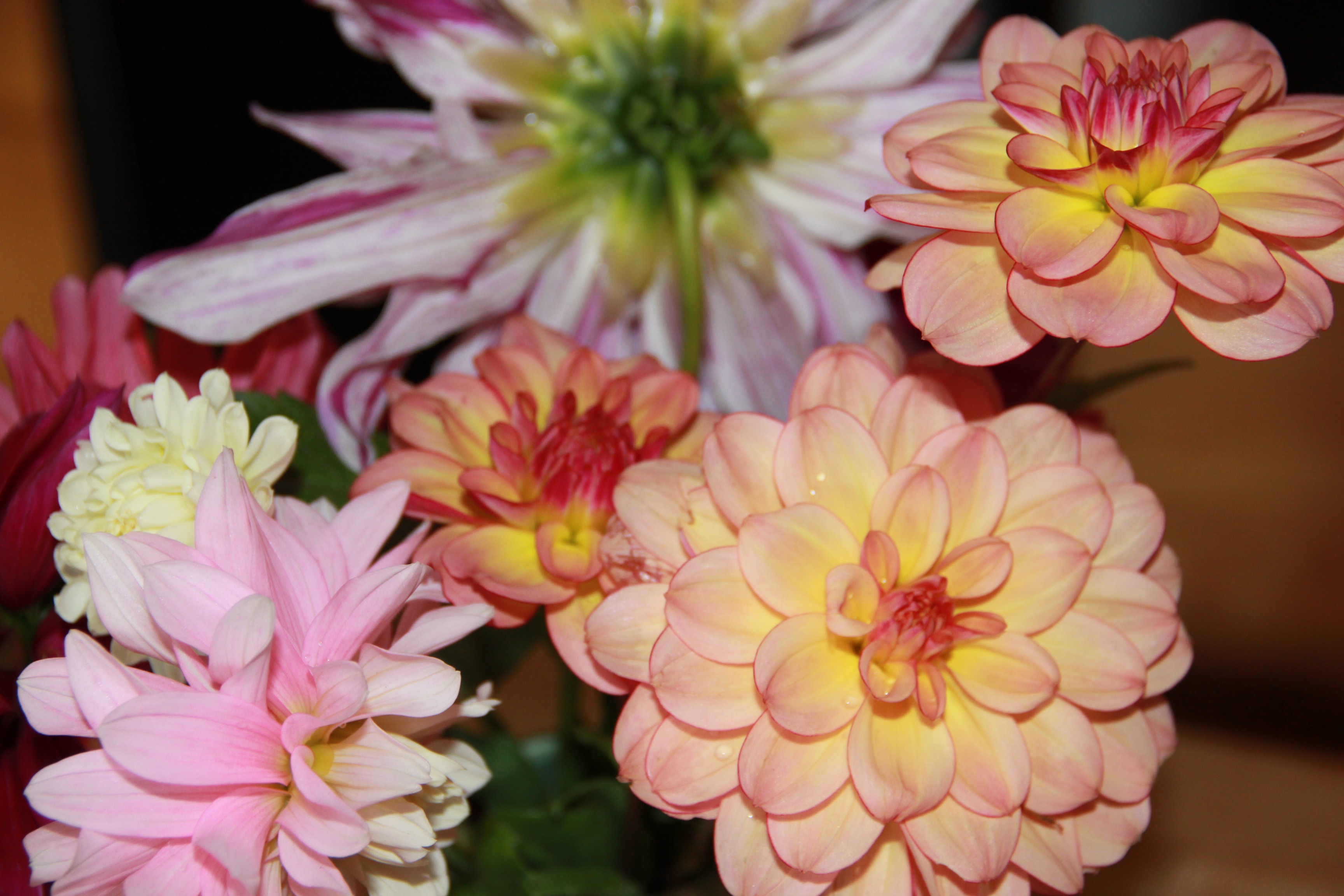 Since the above photos are rather beige and bland, I’ll also post some of the amazing dahlias that are still faithfully blooming in their raised beds at the bottom of our hill despite a few days of pelting rain — rainfall the shaggy manes loved. The gorgeous peachy variety with outlining in red is new this year and called “Rawhide.”