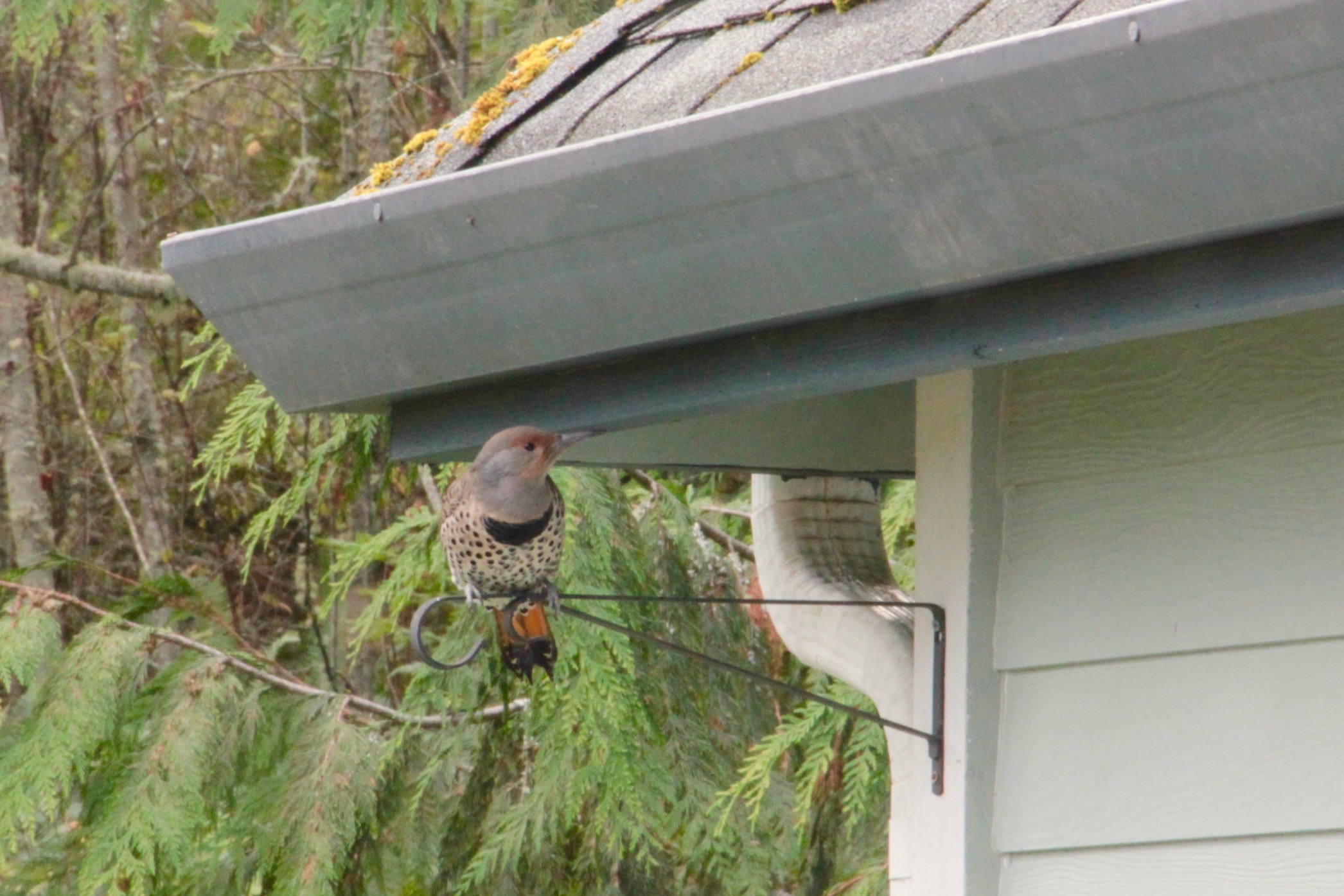 Another flicker awaits her turn, perched high on a plant hook.