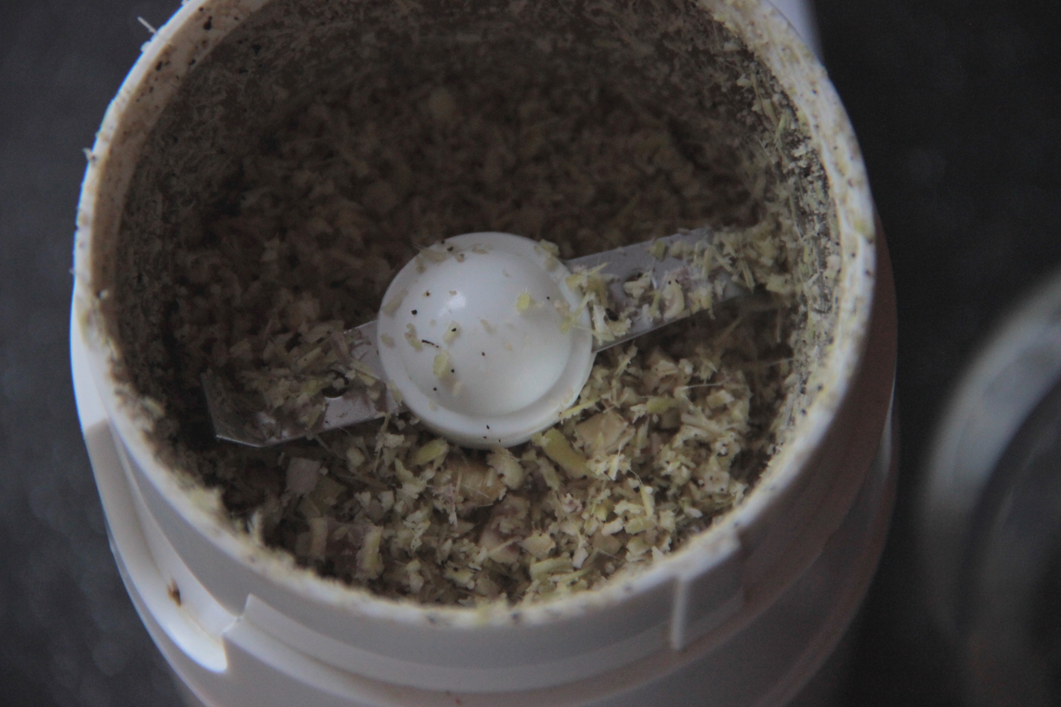 Peeling away layers got me to the interior, somewhat softer portion of the herb. After moving indoors and slicing this pale green and purple portion, the herb was now destined for my handy dandy spice grinder (a coffee bean grinder), where it was further minced in small batches. This extra step is important because even small slices of lemongrass are very fibrous and too difficult to chew — a choking hazard!  I froze the minced lemongrass. I also saved the tops to be pounded and used later to infuse broth.
