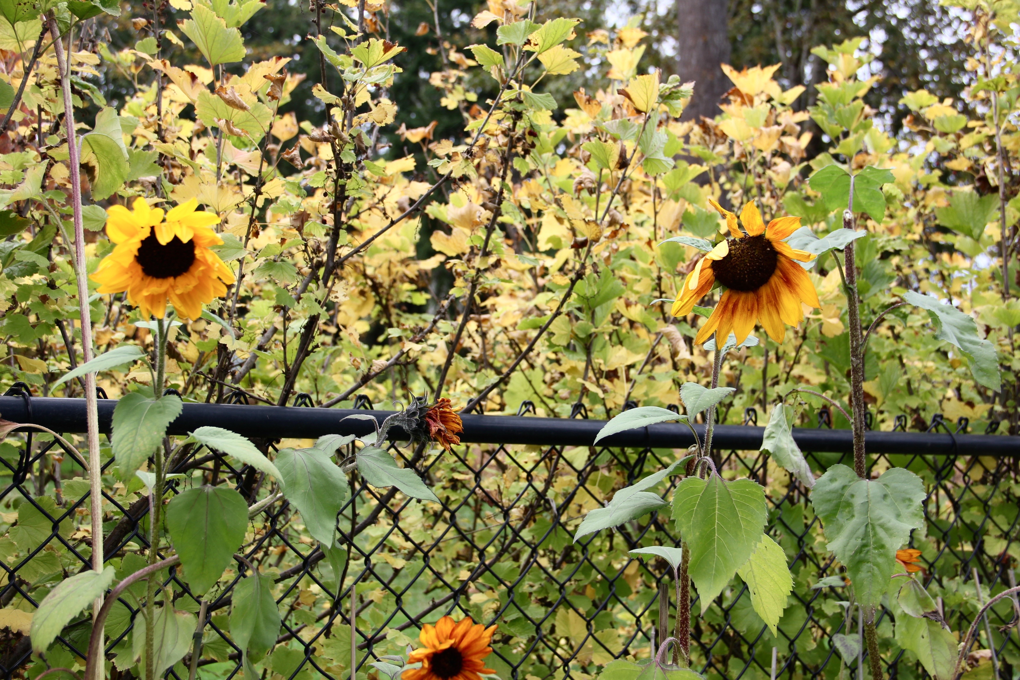 - Sunflowers along edge of veggie garden are winding down. Not as stellar as last year due to storm damage and different varieties grown. Thinking of expanding them to southeast side of garden shed next year. early October