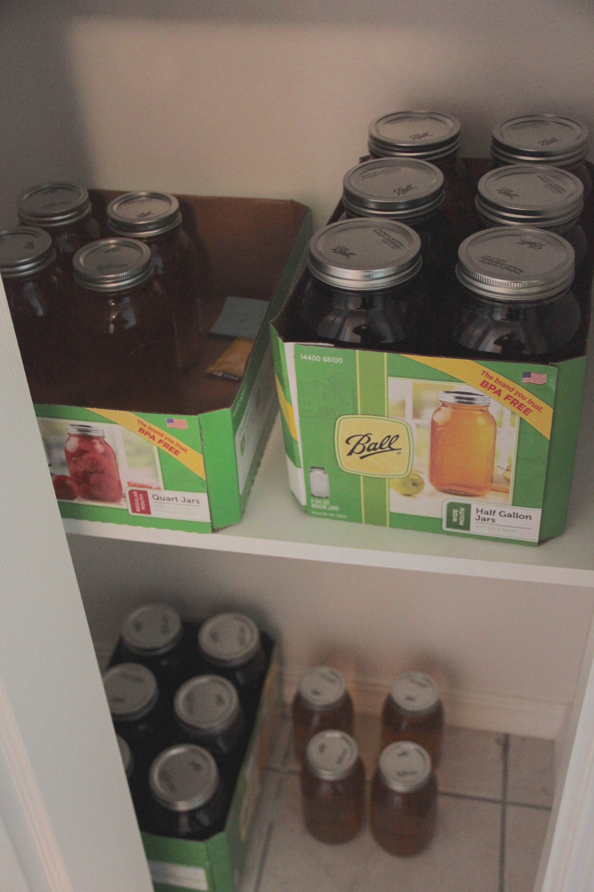 After allowing the spices to infuse the cider for just a few hours, we siphoned the liquid gold into sterilized glass jars of various sizes. We’d researched buying carboys, growlers, and other beverage vessels, but decided this first try to stick with cheap and readily available Ball glass jars. Being unable to control the carbonation is a discouraging factor in using jars, since they’re not built to withstand the pressure inside as capped or corked bottles are. The jars (with loose lids since we’re aiming for semi-still cider) were whisked away to the cool and dark basement where the magic continues. It should be stated that we selected an empty basement closet for storage in case of any minor cider explosions. 😉