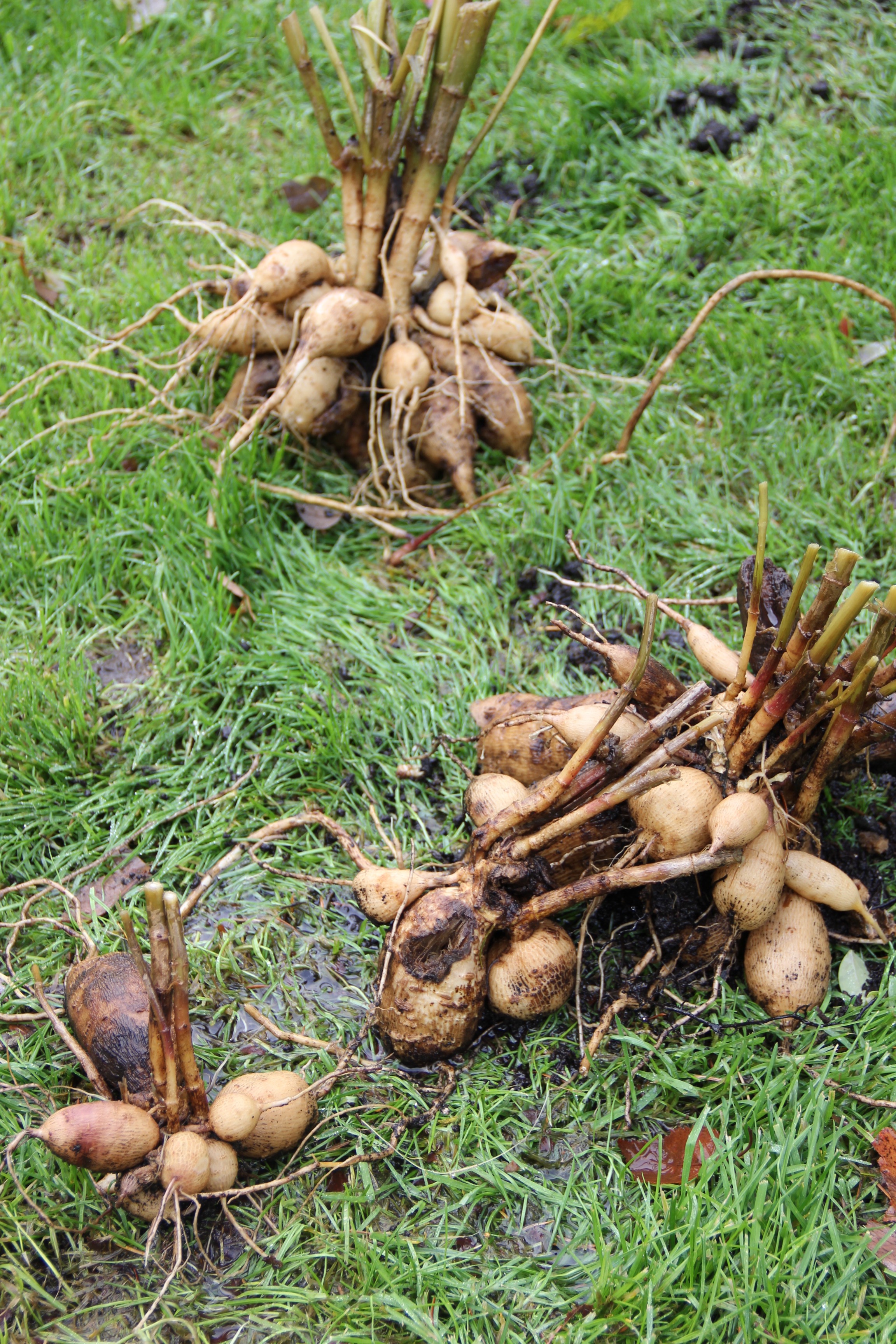 Carefully digging the clumps of tubers, keeping them grouped by variety, hosing them off and allowing them to dry, bagging them in sawdust and shavings, and labeling the bags before loading them into cardboard boxes for storage all takes time and serious effort. It has taken me the better part of two mornings. Many clumps broke apart as I cleaned them, which was a good thing. I’ll divide these further in spring when they form definitive eyes making it simpler to do.