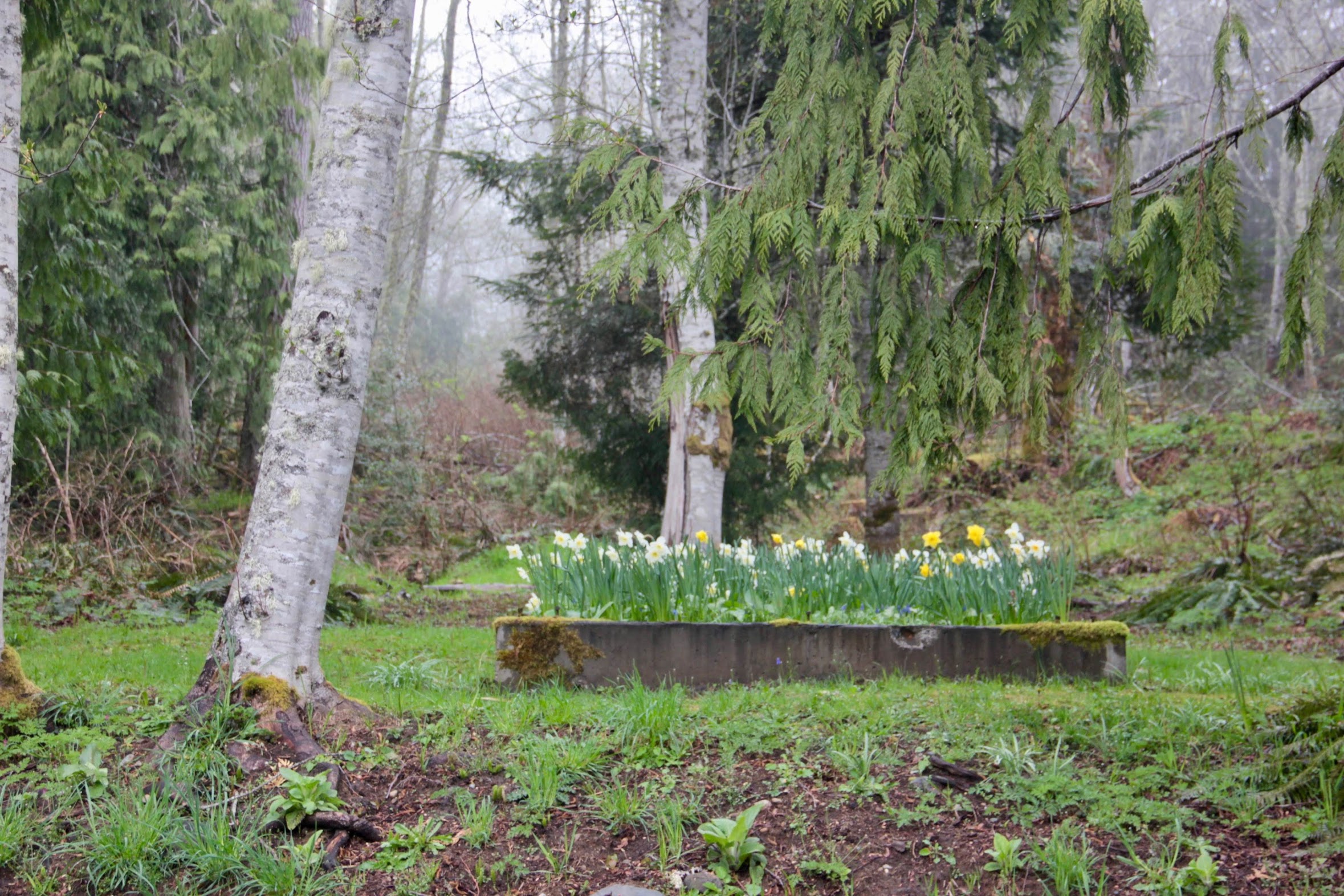 THREE – On the hill across the driveway where the wild portion of our land begins, the old foundation is awash in sunny daffodils, even on grey and misty days. This is the sixth year we’ve enjoyed this spot of flowers, and I still remember the day I discovered it.