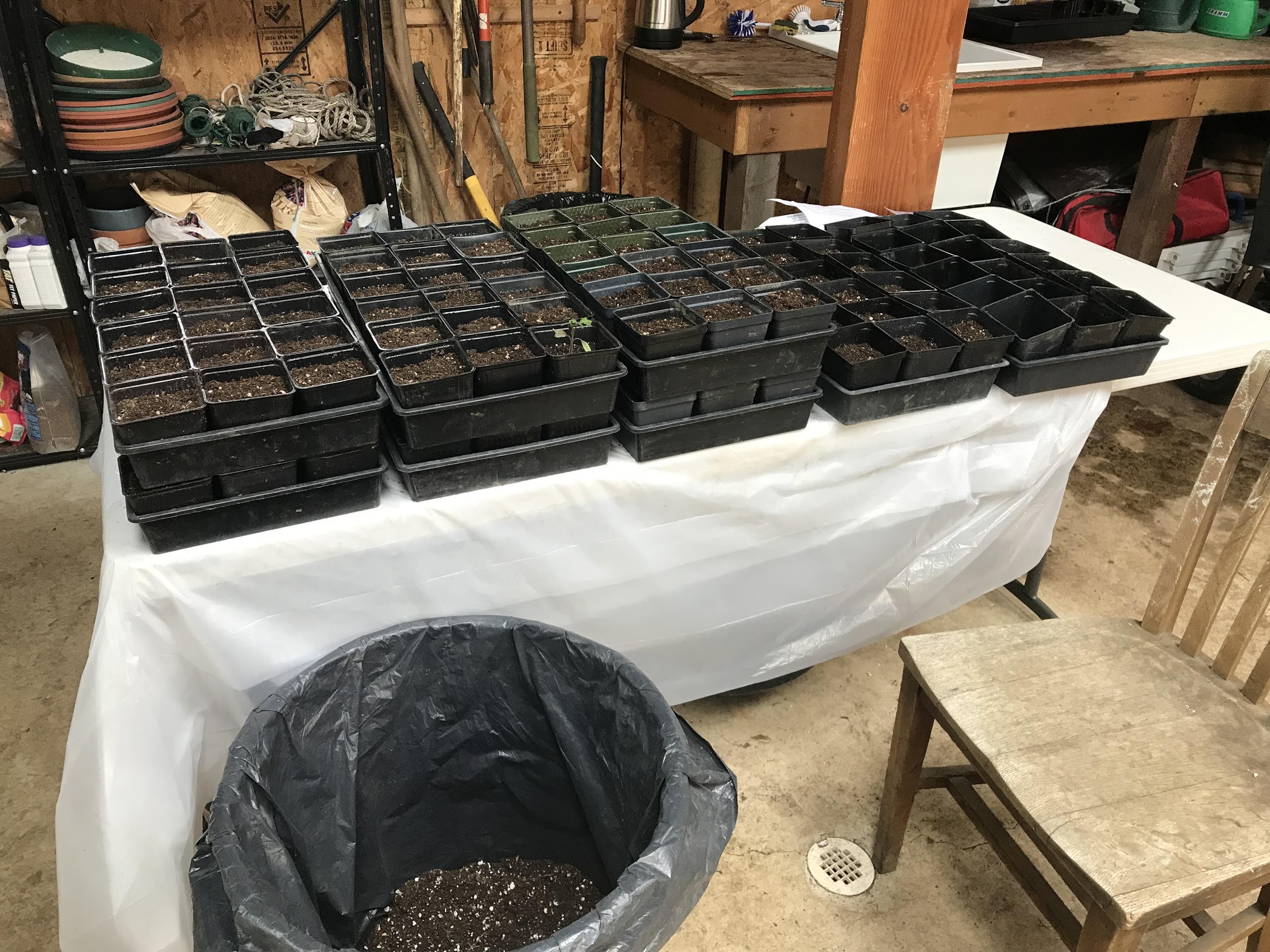 SIX – And finally, one of many projects that are underway for a May Master Gardener plant sale: Potting up almost 200 tomato seedlings! The fun will take place with the help of a couple friends later this afternoon. These six varieties are among those that grow well here in the cool Pacific Northwest: Black Krim, Oregon Spring, Red Siberian, Red Brandywine, Sweetie, and Early Girl. This is just one of the trays and the stacks of 3″ pots that will be their new homes.