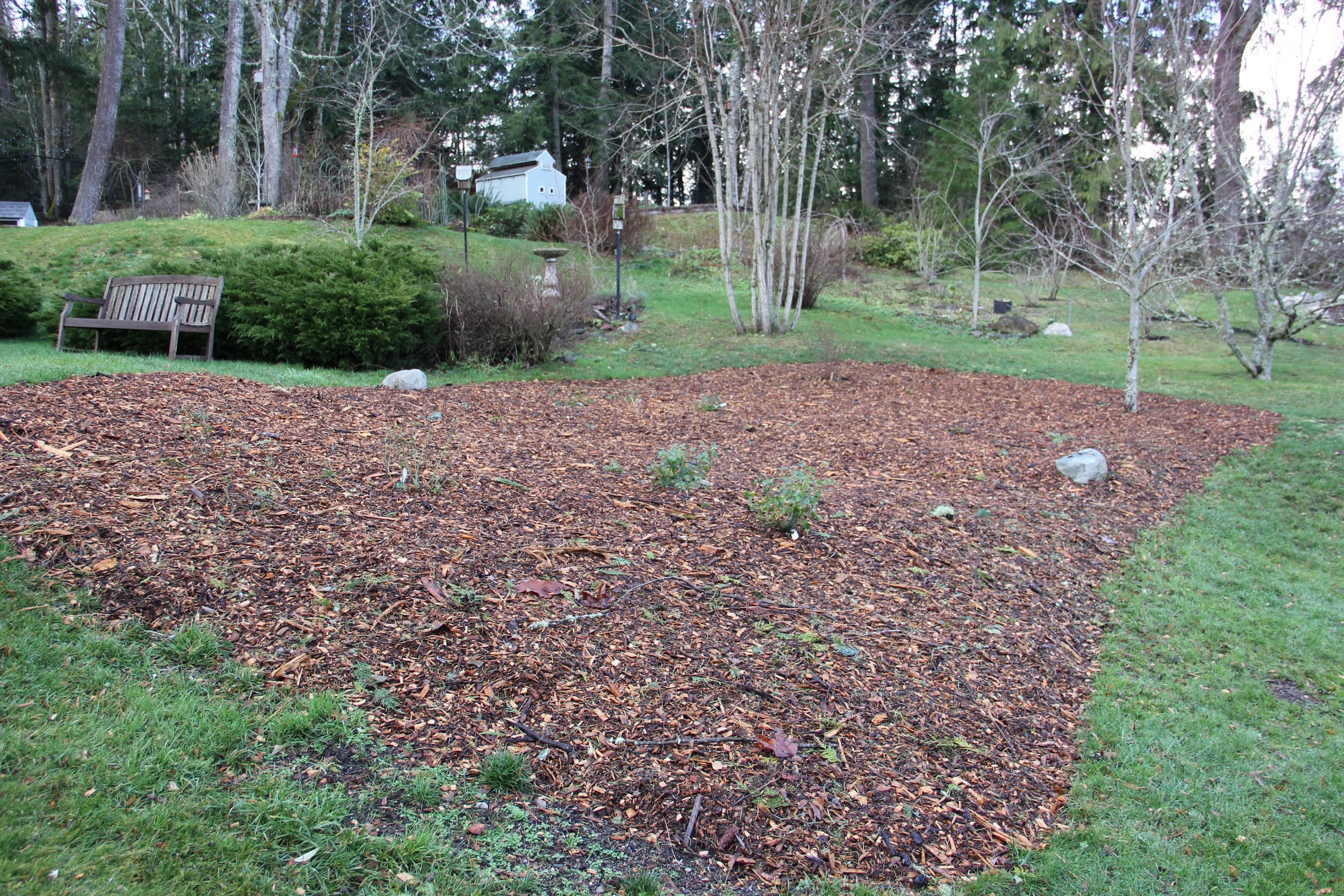 Before winter arrived, we’d planted nine small bushes, three each of Golden Celebration, Munstead Wood, and Gertrude Jekyll. As we are on a mountainside at high elevation (1200 ft.) and zone 7, we planted the crowns about one inch below the soil surface. In December, the new bed really didn’t look too exciting.