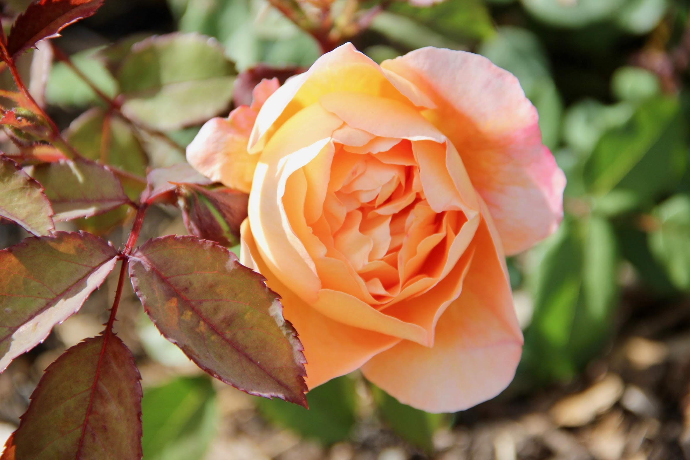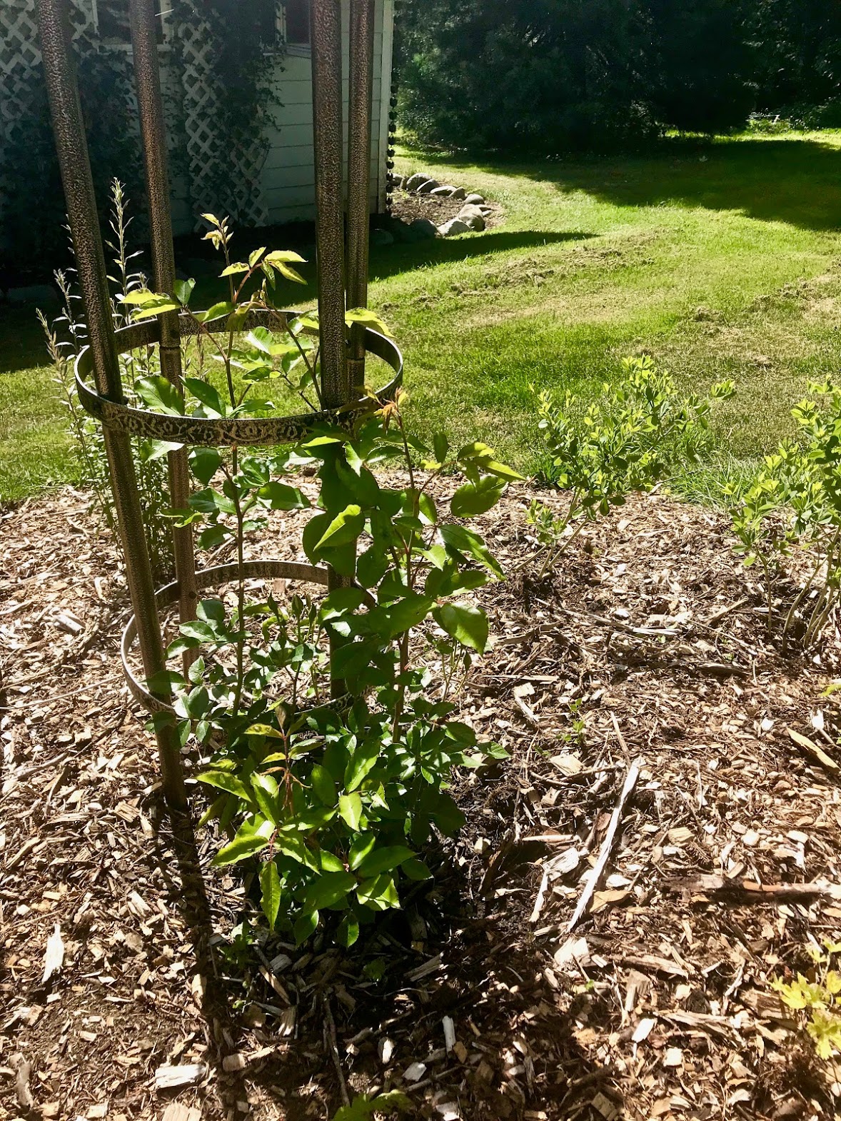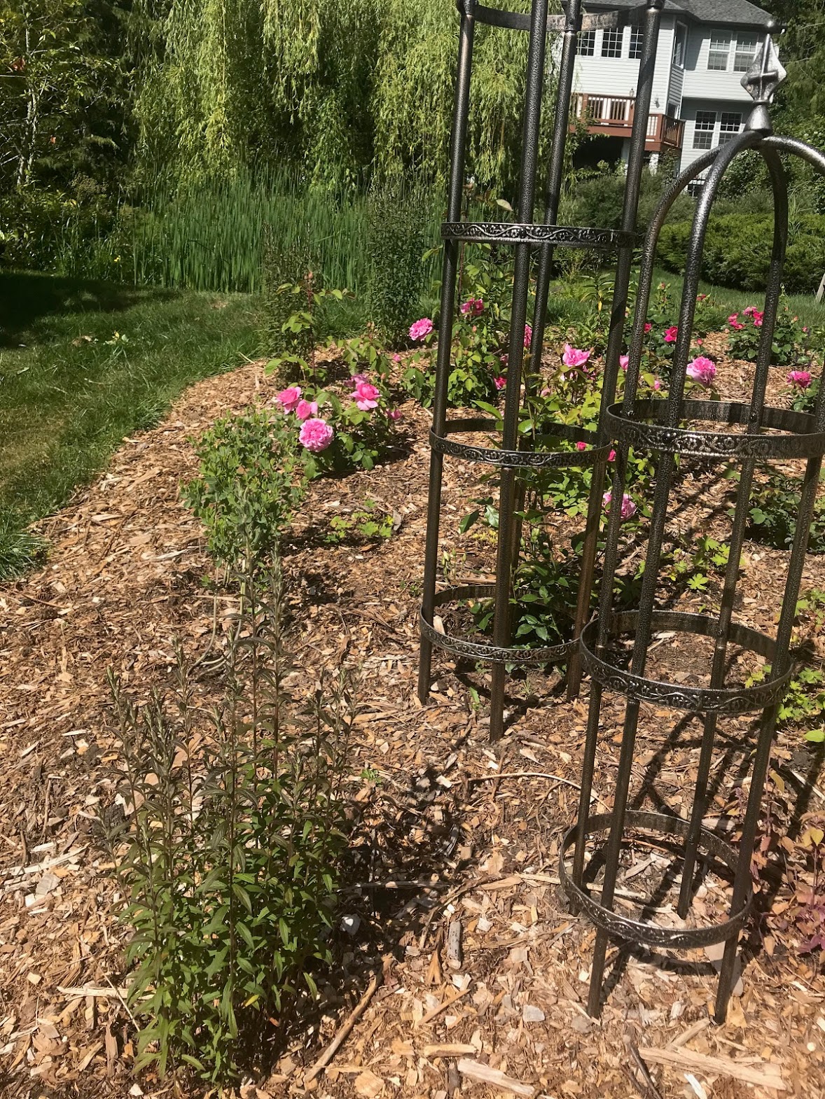 In late March, following an exceptionally snowy winter, six David Austin bareroot roses went in: trios of Lady Emma Hamilton and Princess Anne. Patches of snow are still visible in a photo below of Hubby hard at work, but we were ready! In late April we added obelisks and a climbing Iceberg rose. And finally, in early May my roses from a California grower arrived, and in went one each of Pumpkin Patch, Connie’s Sandstorm, Evelyn, and Jude the Obscure. These individual roses are mostly softer tones, intended as accents among the bright colors. All 20 began to leaf out and grow!