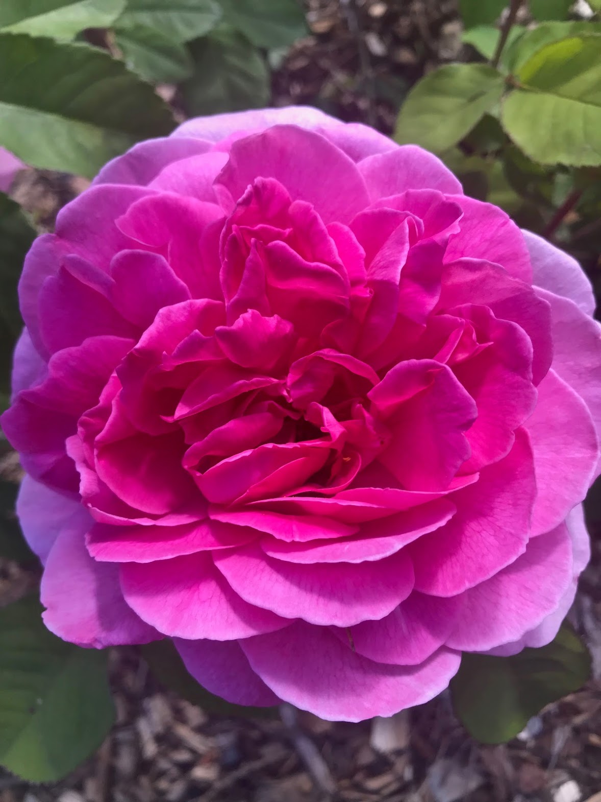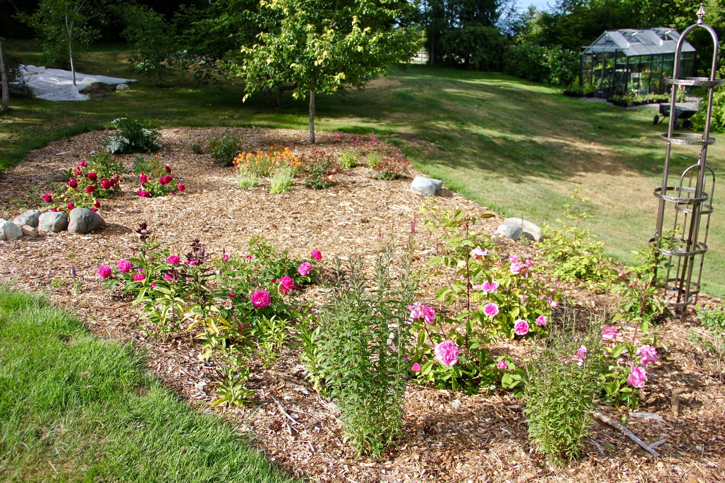 In October and November of 2018, we removed turf on the full-sun slope beneath the pond. We then added about four inches of compost and topped that with a few inches of arborist chips for mulch. The Rose Garden is a rough oval about 45′ x 20′. I’d drawn up plans for placing 15-20 roses, mainly in trios, mostly brightly-colored English shrub roses, all known for their fragrance and disease resistance. A path down the center of the mulch would reiterate our usual walking path leading from the edge of the pond to the garden shed and veggie garden below. One side of the new garden would feature vivid purples and oranges; the other side would be mainly hot pinks and golds.