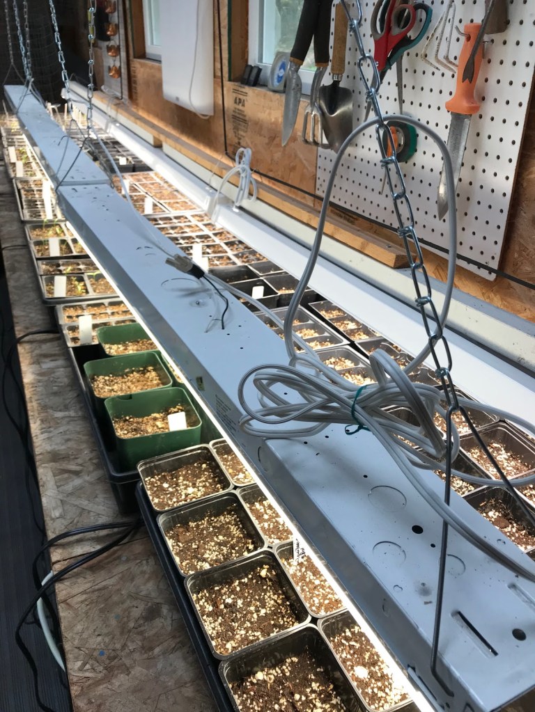 Fourteen trays of flower seeds are planted. Most are perennials destined for a spring master gardener’s plant sale. It’s essential to have patience and to know each seed variety’s germination requirements, from depth of planting, to darkness (i.e. sweet peas) to cool soil or the absence of heating mats (i.e. aquilegia).