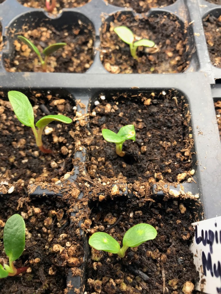 The first to emerge and proudly display their cotyledons are four trays of lupines and sweet peas, followed closely by cosmos and polemonium or Jacob’s Ladder. Soon celosia, delphiniums, salvia, digitalis, scabiosa, and aquilegia will join the party. It all reminds me a bit of the old-timey horse race games at carnivals — “Now in the lead are the sweet peas, but coming from behind are the salvias!” Slow and steady wins this race!