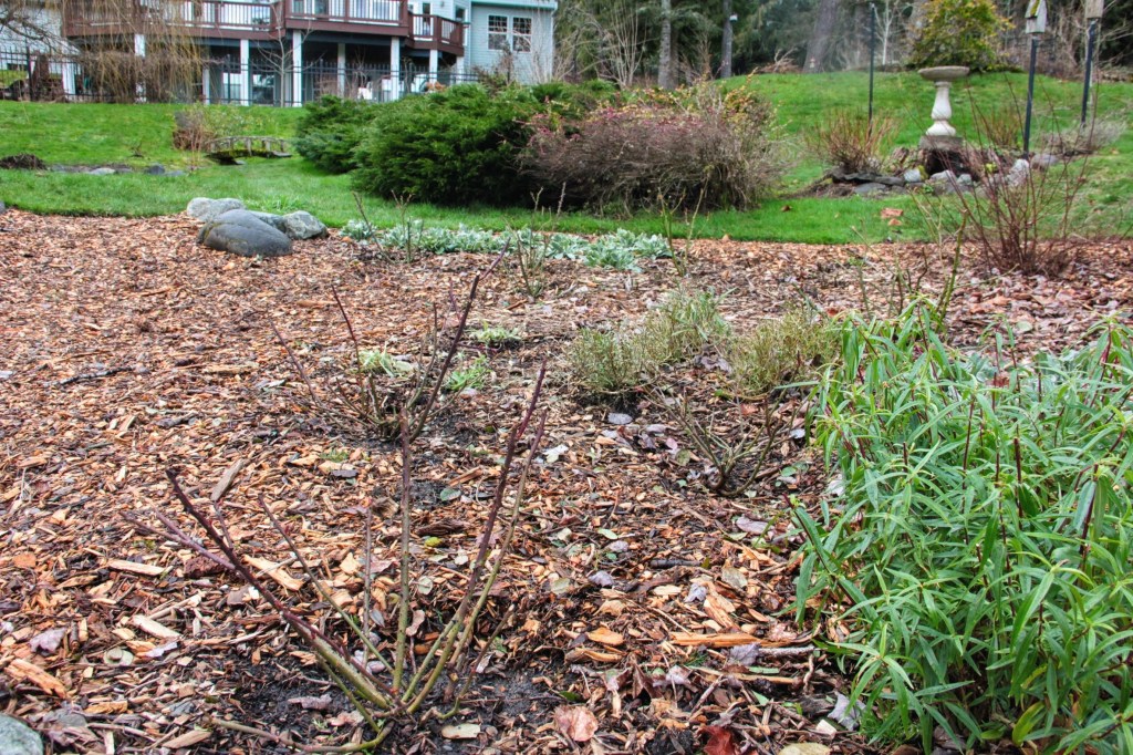 The biggest surprise with the new English roses is how they held onto their leaves until now. The final bushes in need of pruning are shown below — a few Princess Annes and Gertrude Jekylls. As with each of the shrub roses, I’ll strip the leaves as I prune. The second photo shows part of the other side of the rose garden, fully pruned.