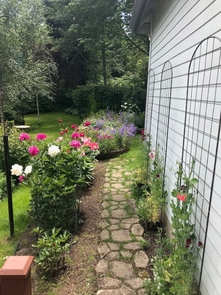 This week our weather has turned decidedly chilly and drizzly. It doesn’t feel much like summer. The cucumbers and squash are rebelling, but the peas couldn’t be happier. Peony season has been nicely extended!