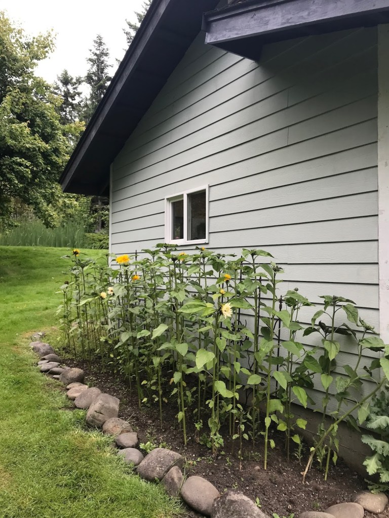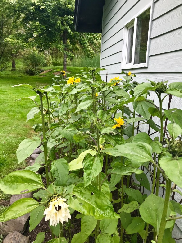 SIX – Finally, some before and after shots of the sunflower patch behind the garden shed. Shown are early June and early July contrasts. The slugs have had their way with plenty, but the first surviving flowers are slowly opening, revealing some interesting varieties. C’mon, sun!