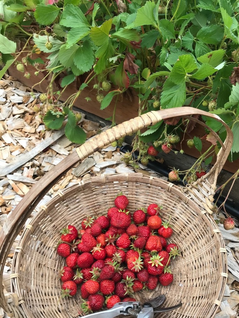 THREE – 4th of July is the time for Coppertop strawberries, and we’ve been eating them by the handful. My sister, Meg, has already made us a delicious strawberry rhubarb crumble with some of the pickings. Yesterday I attempted to rescue many more before overnight showers could ruin them.