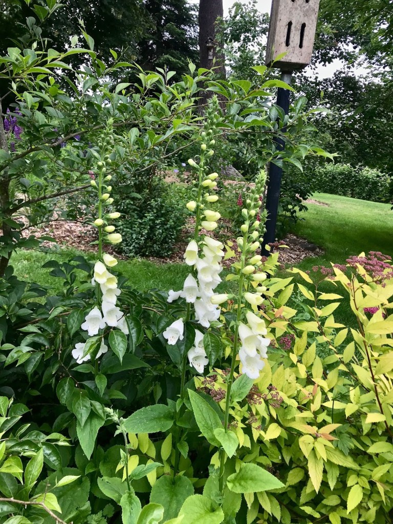 TWO – An area of the garden with a trio of birdhouses is looking lovely currently. Spiraea and digitalis are featured here, including some new solid white foxgloves I started from seed this year.