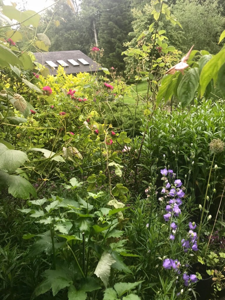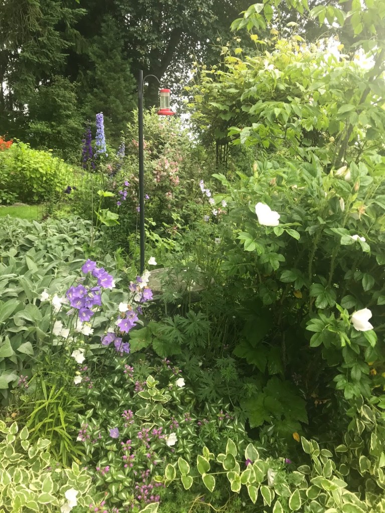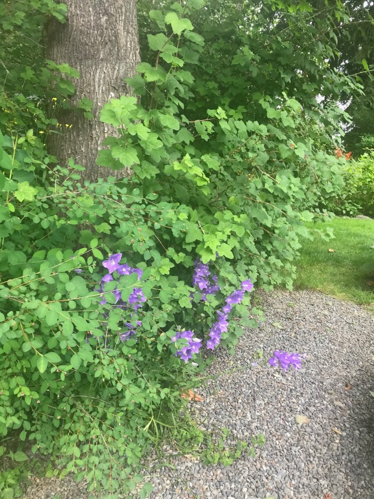 FIVE – Also in the perennial beds, it’s the season for Campanula persicifolia or bellflowers to peek through other plants in many of the beds. As all gardeners know, these readily make their presence known! I don’t mind.