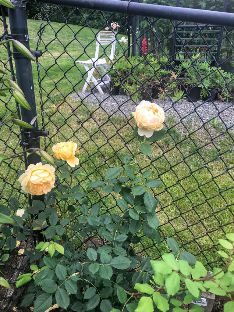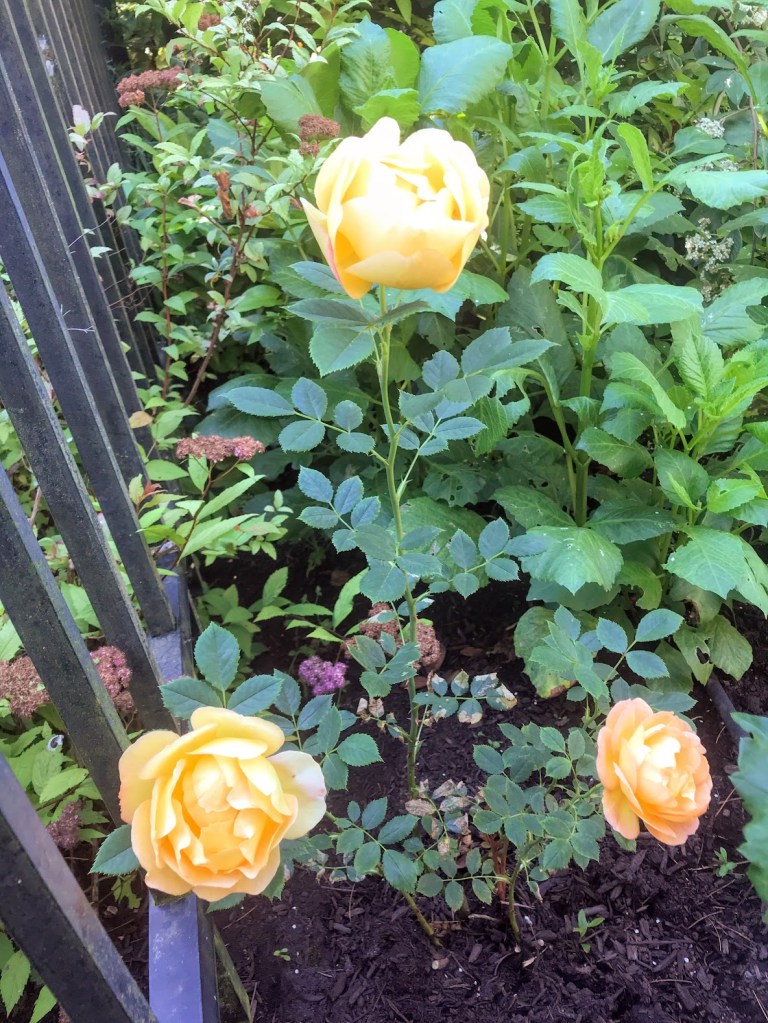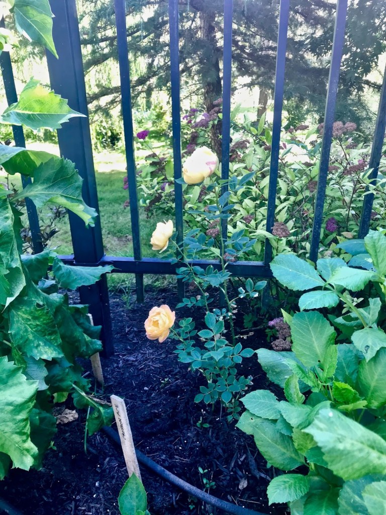 FOUR – Continuing on the rose theme, I added three David Austin climbers along fences around Coppertop this spring, mainly to replace some once-and-done, blackspot-prone, hot pink climbers that were here when we moved in. Below are peachy Lady of Shalott and golden Graham Thomas, captured a couple of weeks ago with their very first blooms. Now they’ve grown substantially. The third new climber, A Shropshire Lad, is forming first buds. By next year I have no doubt these will fill the fences.