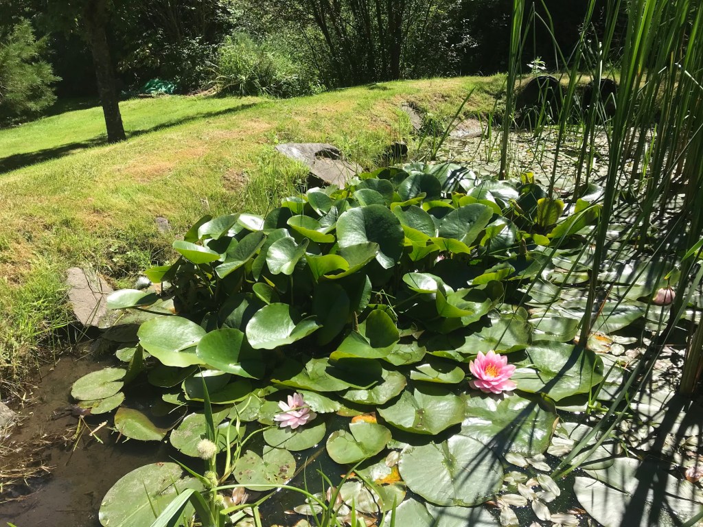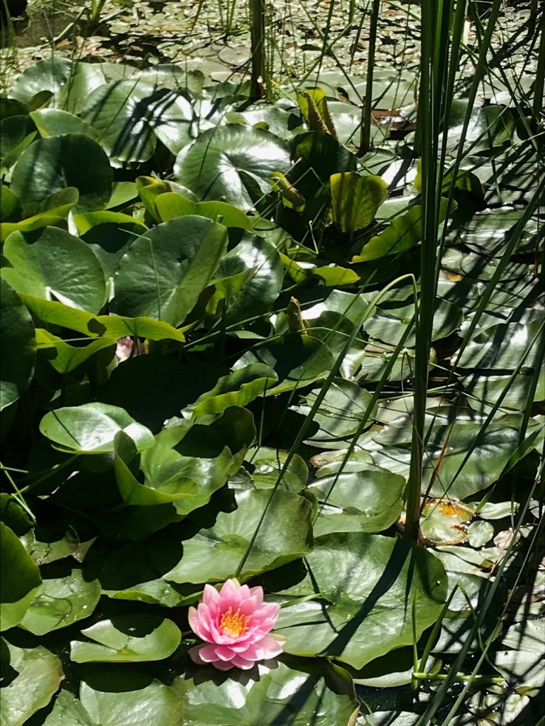 FIVE – The pond is brimming with grasses and waterlilies. It’s next to the rose garden where I spend a good amount of time sniffing and clipping, and my eye is captured by the shadows and light at play and by American goldfinches who bathe and feast in lily pads. I attempted to post a short movie with the birds’ sweet antics, although it’s a bit hard to see them. The mower starts up mid way, too — ugh.