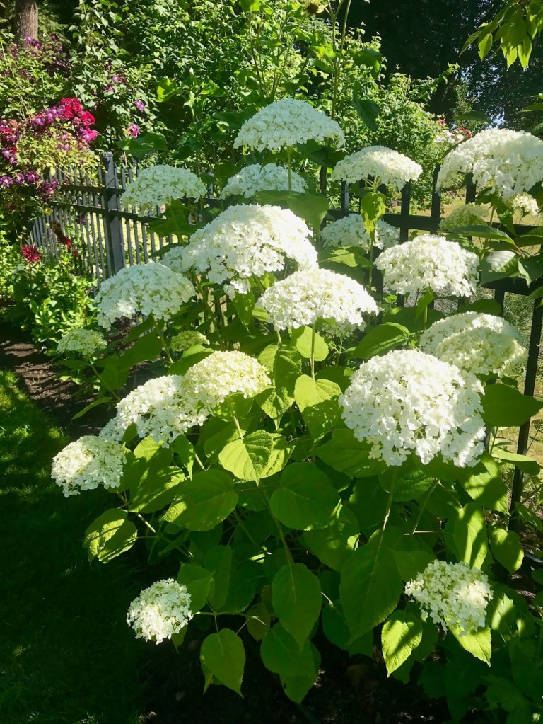 SIX – I’m enamored with three, new Hydrangea arborescens ‘Incrediball’. Silly name, gorgeous flowers. The blooms are bigger than basketballs and stay upright! These glow at dusk when we’re enjoying the deck. The entire row of plants is new this year, another place we removed lawn and added a border. The border includes hydrangeas, dahlias, penstemon, clematis, roses, geum, and other plants I’ll share another time.