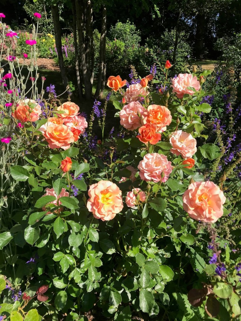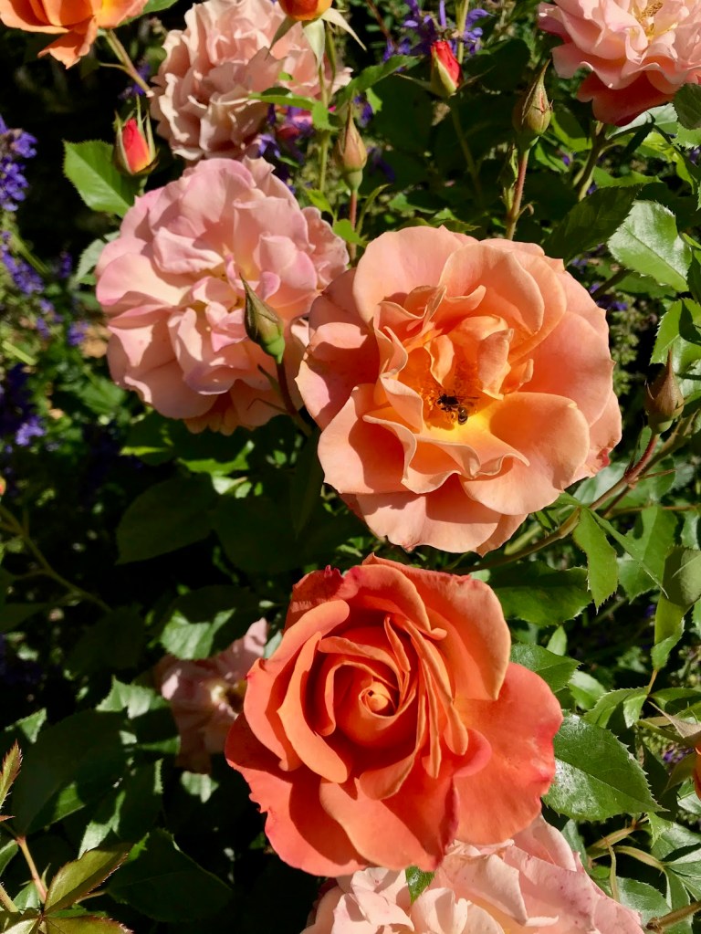 TWO – Jumping down to the rose garden, I completely love ‘Pumpkin Patch’ for her many shades of peachy orange on one floribunda. Bees love her, too.