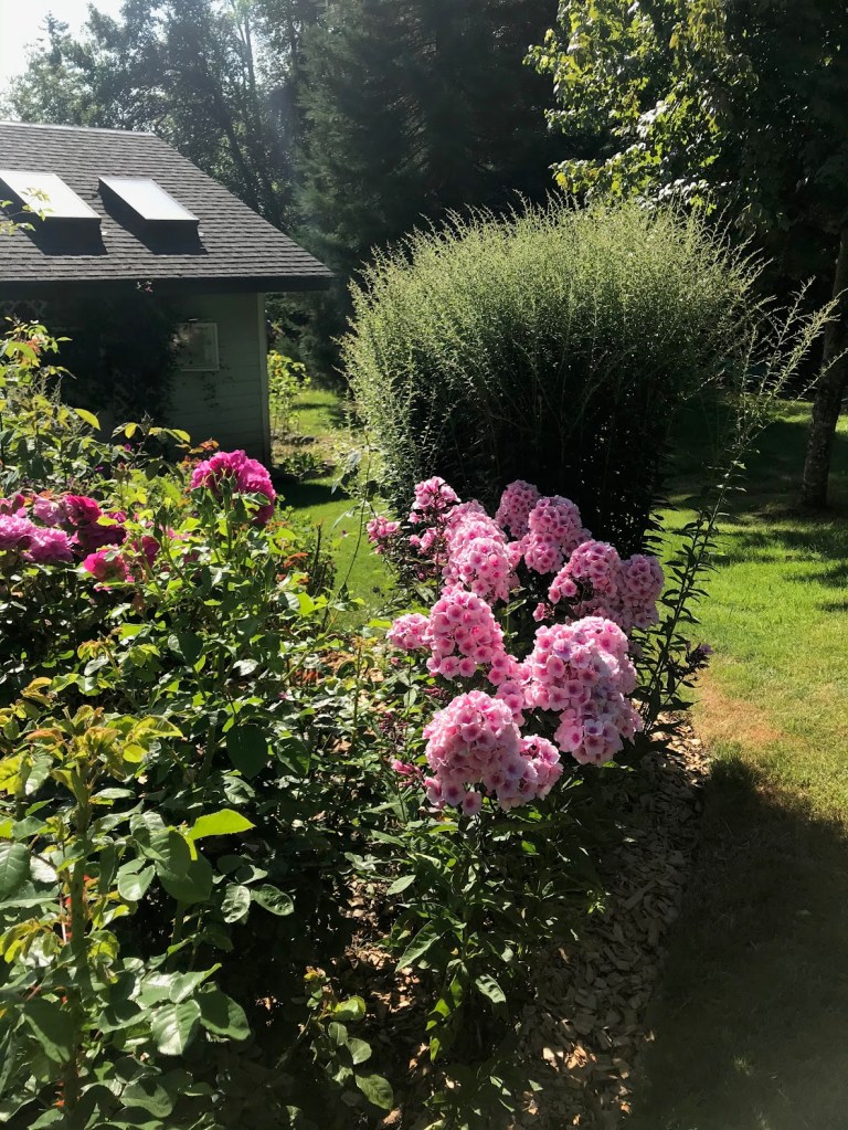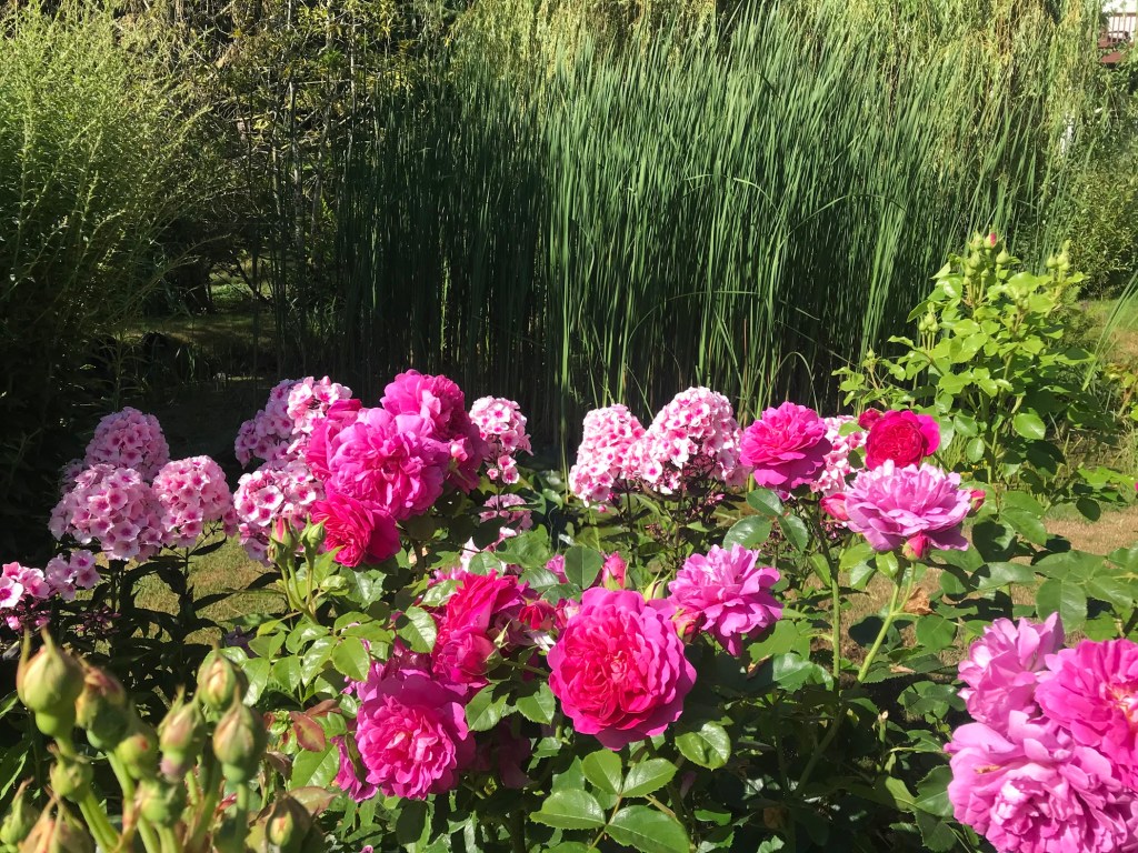 THREE – Bordering one edge of the rose garden, a generous patch of Phlox panicualata ‘Bright Eyes’ has a home on the side that features golds and pinks. The mingling of her perfume with the roses’ is just about heaven. Behind her, Solidago rugosa ‘Fireworks’ or goldenrod will be opening soon. Beside her is a trio of ‘Princess Anne’ roses.
