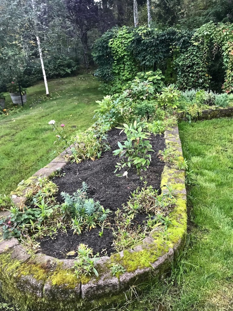Fall is the very best time for planting peonies. I’d hoped to bulk up and extend their season here by filling some bare and sunny spots with new tubers. I love to think that these new peonies will outlive me, a legacy blooming for future generations. Once established correctly, peonies promise to get better year after year, and it’s important to plant peonies where they will thrive without being disturbed for many years. At least half of the new varieties will be planted with other young peonies in this large, full-sun, raised bed outside the kitchen. The bed has been prepped by the removal of many unimpressive hardy geraniums and catmint.