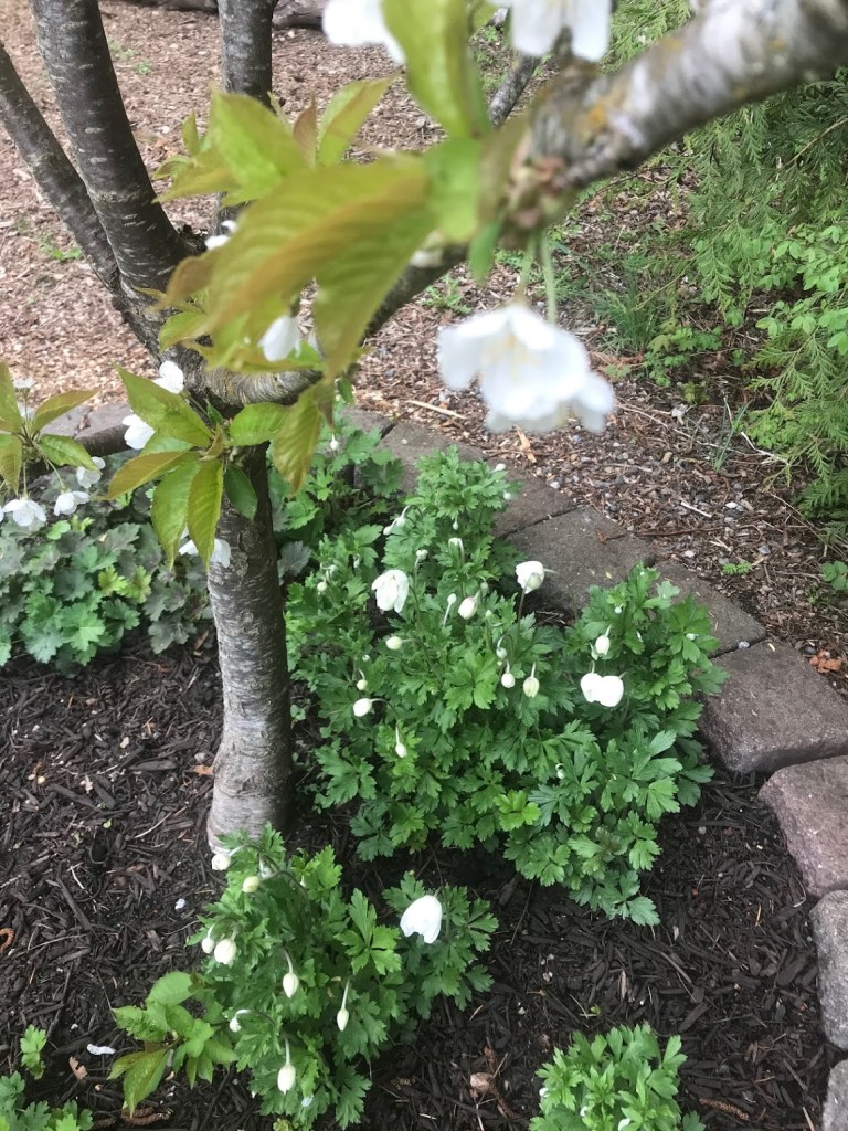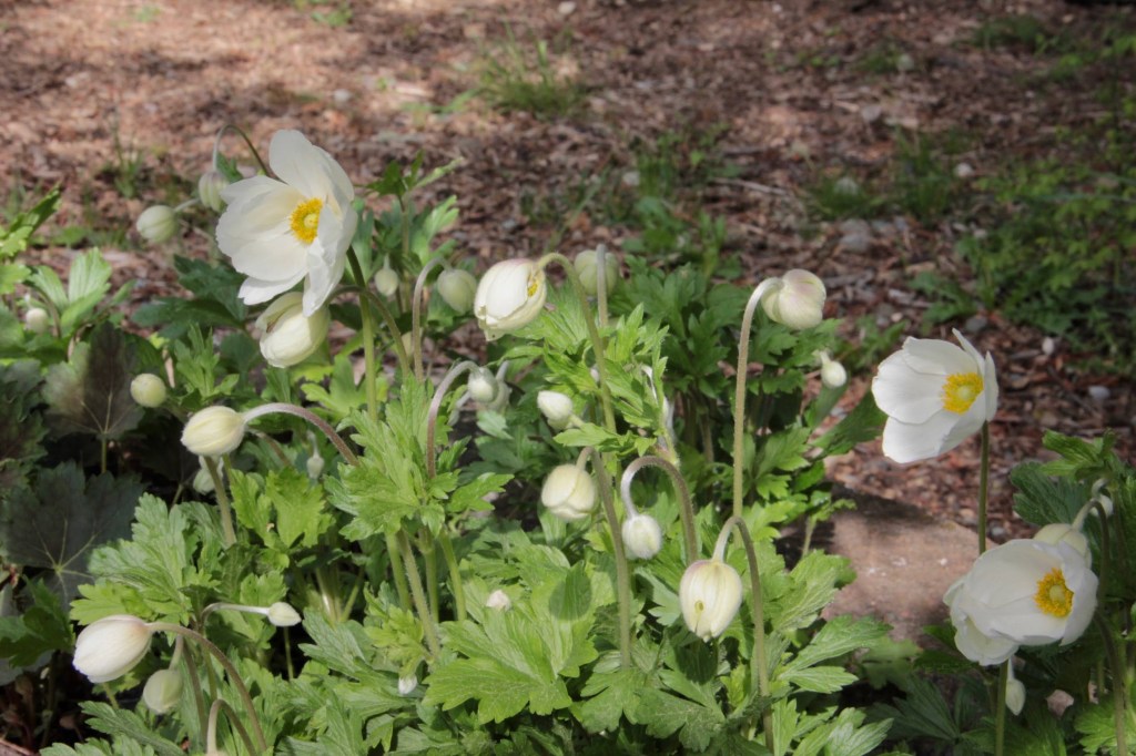 FOUR – Up on Chicken Hill, beneath a young Rainier cherry tree, a bunch of Anemone sylvestris ‘Madonna Snowdrop’ are lovely as their petals open in the morning sun. A cloudy afternoon, and their petals close up again. I’m sure glad I started these from tiny seeds a few years ago. Next year: more, please!