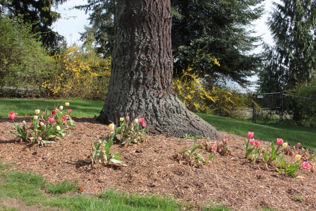 ONE – Mid-spring on our mountain means daffodils have almost faded, except for some of the late Delnashaugh, and more tulips are opening each day. We don’t have much success with tulips returning, so I treat them as annuals. That said, we plunked some bulbs from faded “perennial” tulips into soil around our biggest Douglas fir tree late last spring and many of them made a showing. Here are the remaining blooms, and yes, forsythia is still in bloom in the background.