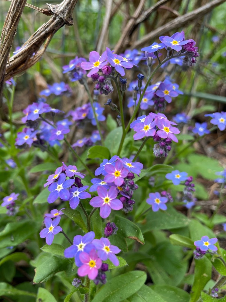 SIX – It’s fitting to end on a sweet, if weedy note. These woodland forget-me-nots, Myosotis sylvatica, pop up all over Coppertop, as they’re known to do around the world. They invite us to bend in close for detail, appreciating the moment in the garden.
