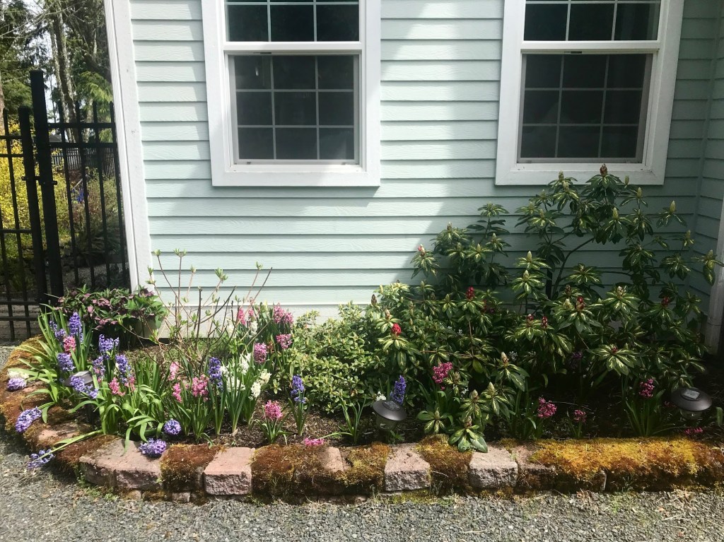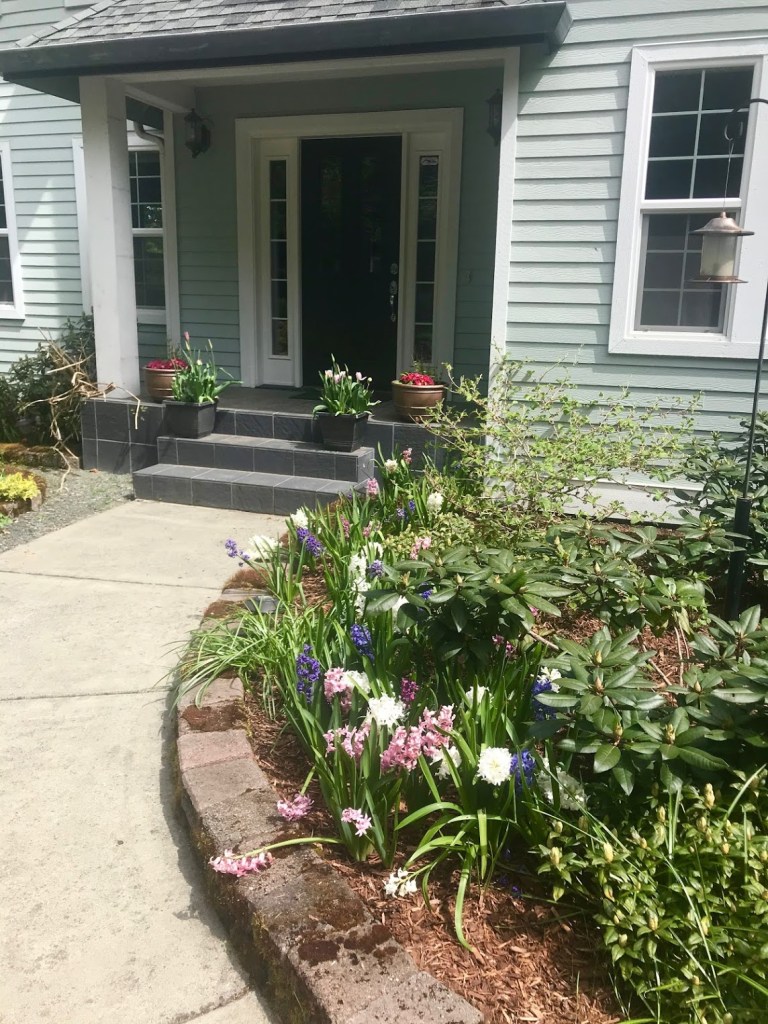 FIVE – We’re having the exterior of our house painted this month, and it will be an enormous project. I’m already sweating the care and protection of plants in the danger zones. The front exterior has been filled with the fragrance of Hyacinth orientalis in a riot of pastel colors I can appreciate only in springtime. Next to bloom will be the rhododendrons, if they all survive the painting. We removed the gigantic Clematis Montana from the white pillar in preparation, and it’s already springing back to life.