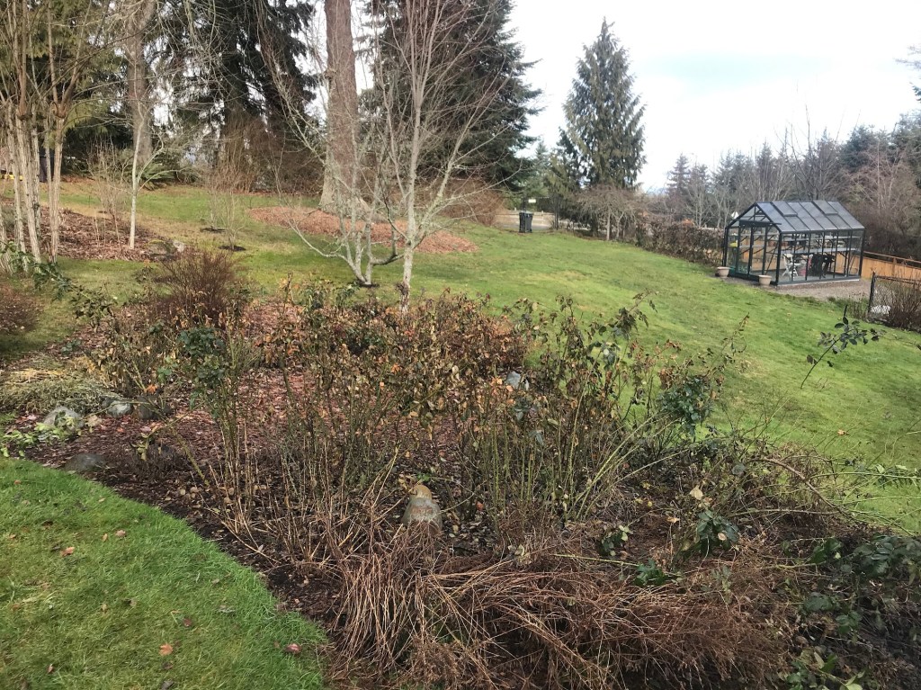 TWO – My hope is to get into the rose garden when the slope isn’t slick or icy and begin the pruning there. A week ago I took this rather sad before shot of over 20 rose bushes and some perennials that await me: