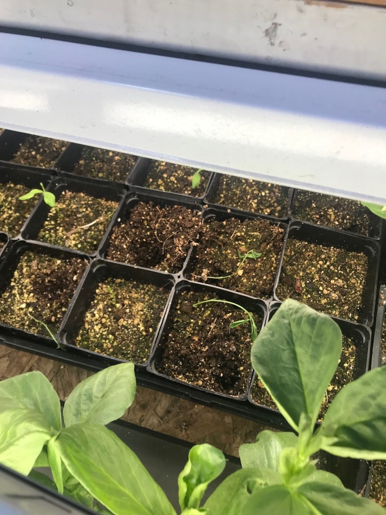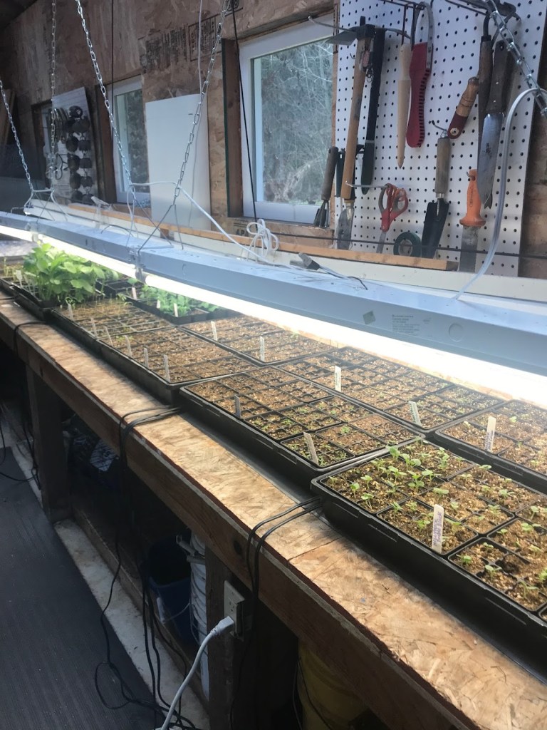 THREE – I began starting flower seeds in the garden shed at the very end of January. The perennials and annuals I started are intended for another May Master Gardener plant sale. Germination was a success, but a double whammy of travel and a voracious mouse have done in some of my seedlings. Plenty of dianthus, delphiniums, digitalis, hollyhocks, and others survived, but the cosmos and sweet peas were decimated. It’s hard not to be discouraged. Various mouse elimination strategies have been deployed! The long row of heated seed starts, and evidence of mice: