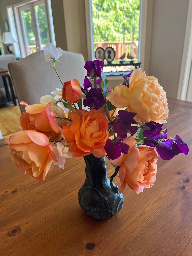 1. Hi there! The first climbing rose is Lady of Shalott. Further on in the post, in a vase with magenta sweet peas is Lady Emma Hamilton. Such lovely, dependable peachy ladies. All the roses I grow are fragrant — who has time or garden space for ones with no fragrance?! 😉