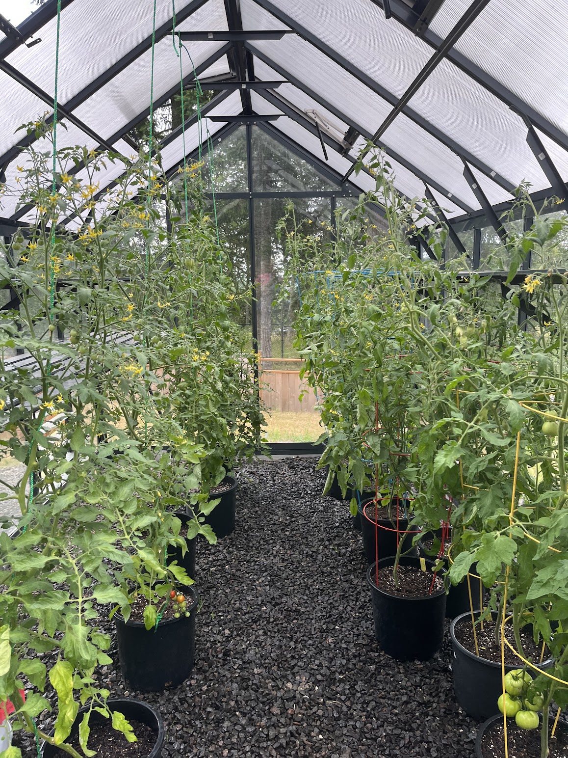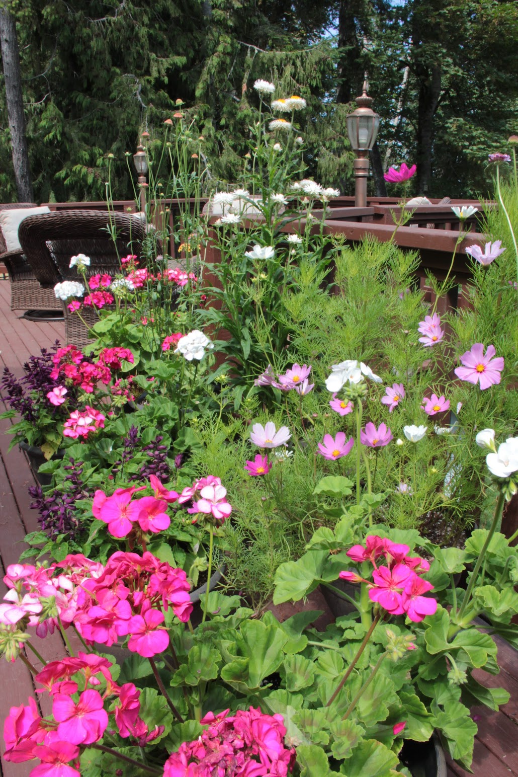 Mid-July into August brought some warm weeks. Tomato pots in the greenhouse produced plenty for sauce making. The varieties I’m growing this year include Supersweet 100, Amish Paste, Opalka, Oregon Spring, Principe Borghese, and Artisan Bumblebee. This year all the pots on our deck are filled with flowers started from seed by me many moons ago. The Maverick geraniums continue to produce, as do the scabiosas and salvias. Glorious sweet peas reached peak bloom and are now beginning to fade.