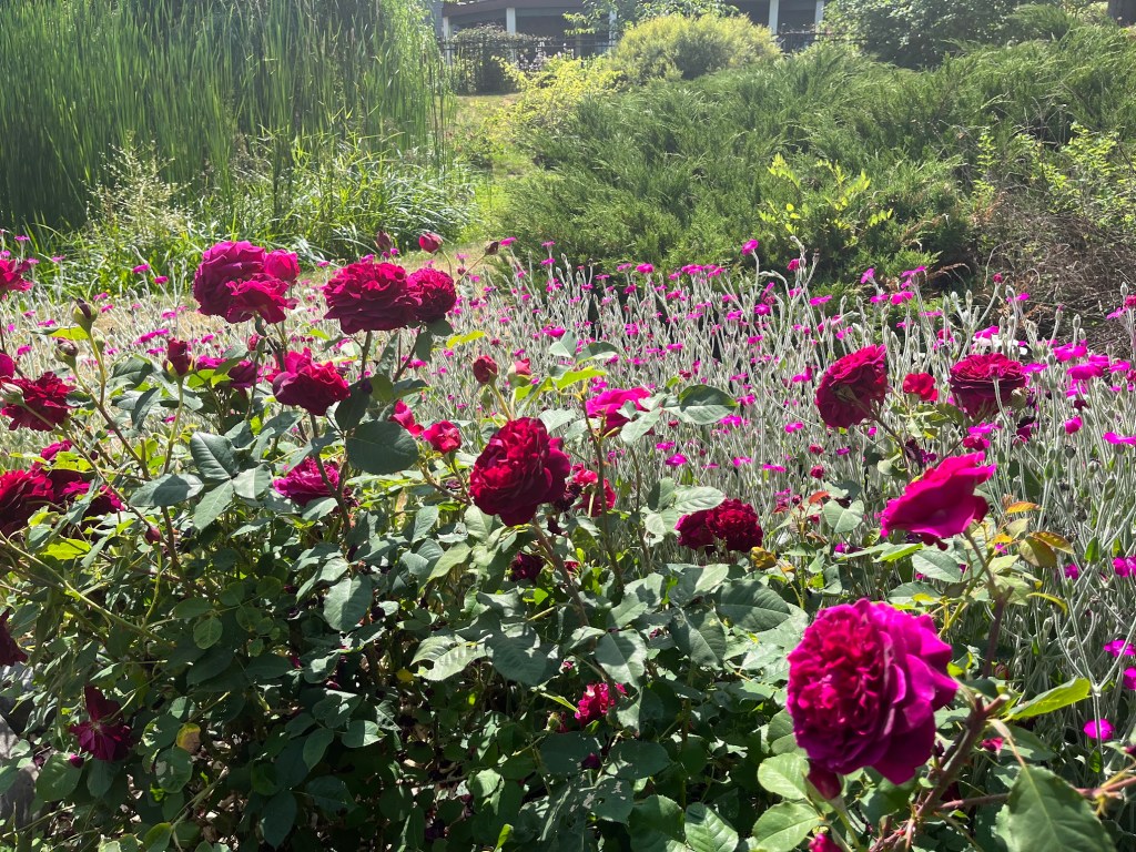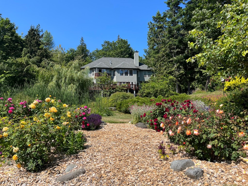 Some people are surprised to learn that our local Pacific Northwest summers are super dry, similar to Southern California, although not as hot. We haven’t had even an inch of rain all summer. We let the lawns go dormant each summer, and they spring back to green when the early fall rains begin. Our deep well allows us to irrigate the vegetable garden and other areas through drip systems. Due to drought, I have seriously limited other watering this summer. Perhaps there are fewer blooms in the dahlias and some other areas because of it, but there’s still plenty of color. I’ve watered my rose garden only three times — very deeply.
