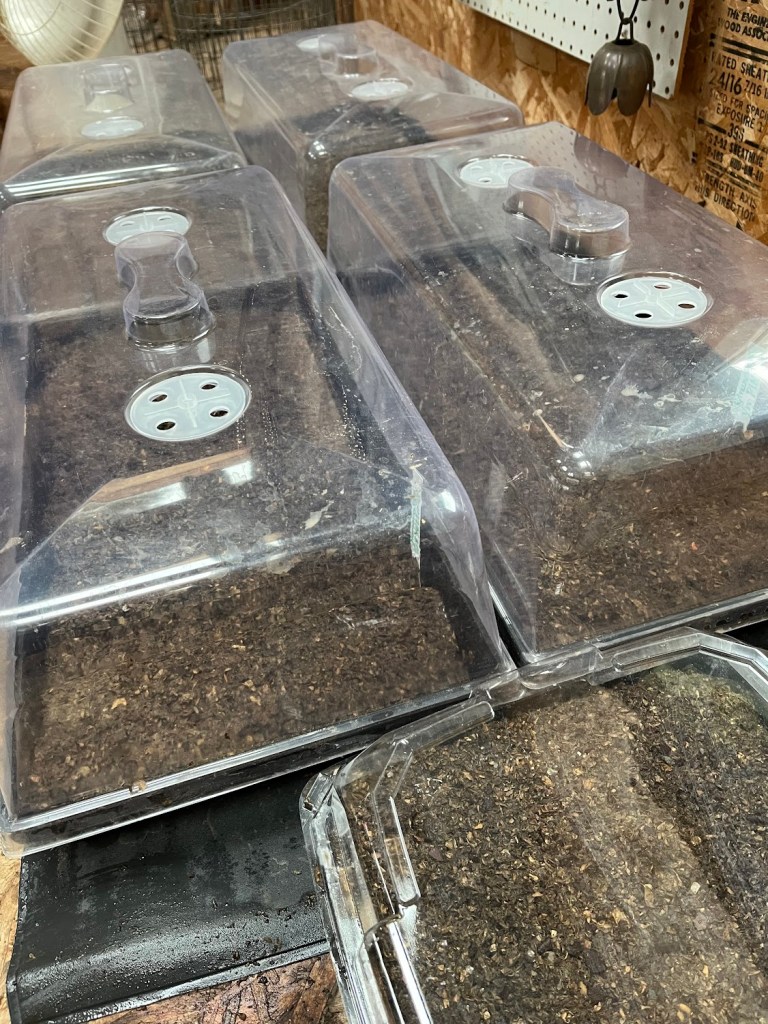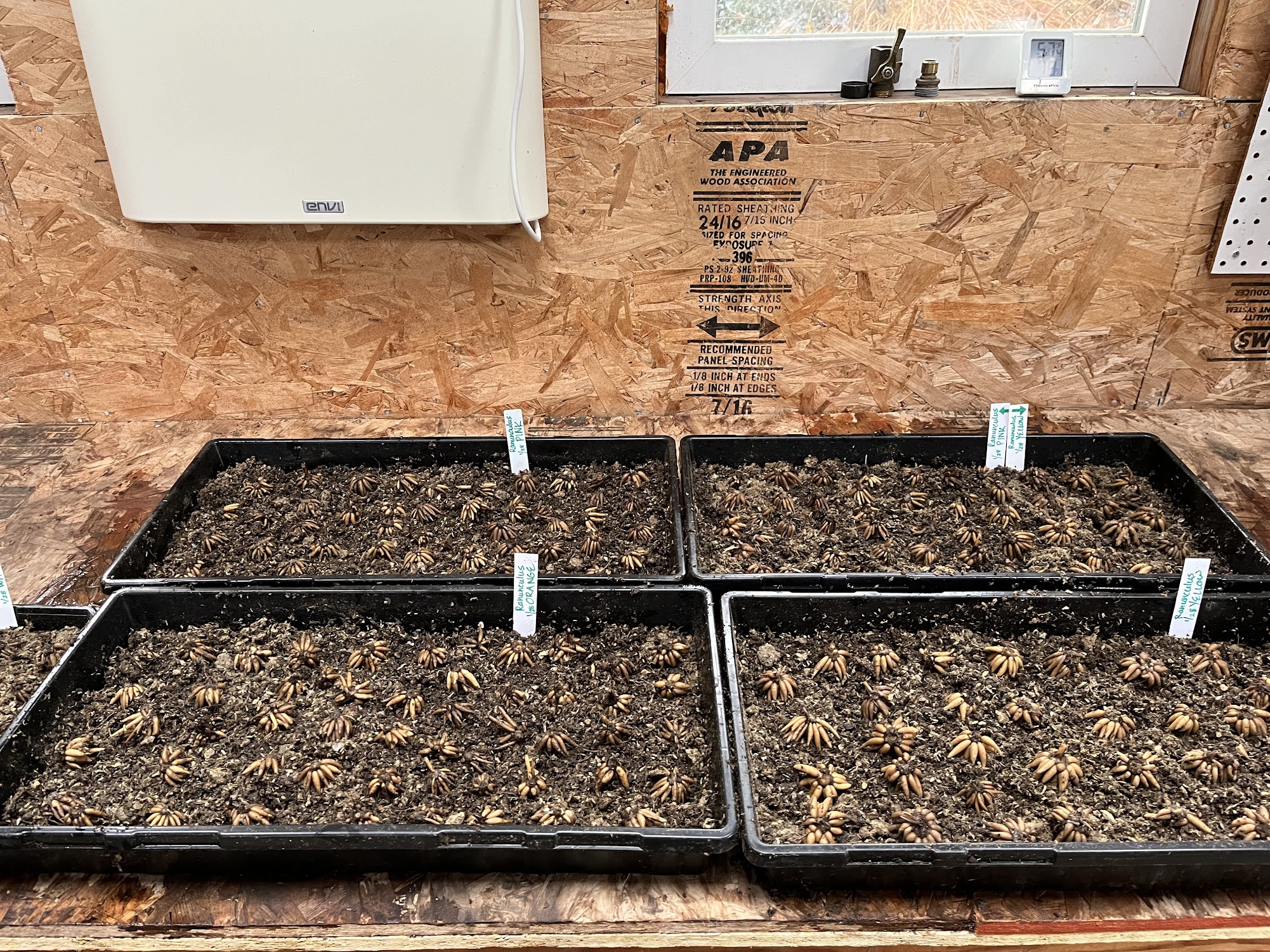 The tiny corms resemble octopuses/octopi or mini dahlia tuber clumps, each clump just 1-2 inches wide. They require soaking for 24 hours before planting. I plant them closely in shallow trays of slightly damp soil. After distributing the corms, I cover them with a 1/2 inch of soil, cover them with humidity domes (mainly for protection from hungry mice who frequent the shed), and place them on heat mats because the garden shed is currently unheated. The heat isn’t really required but may boost initial success.