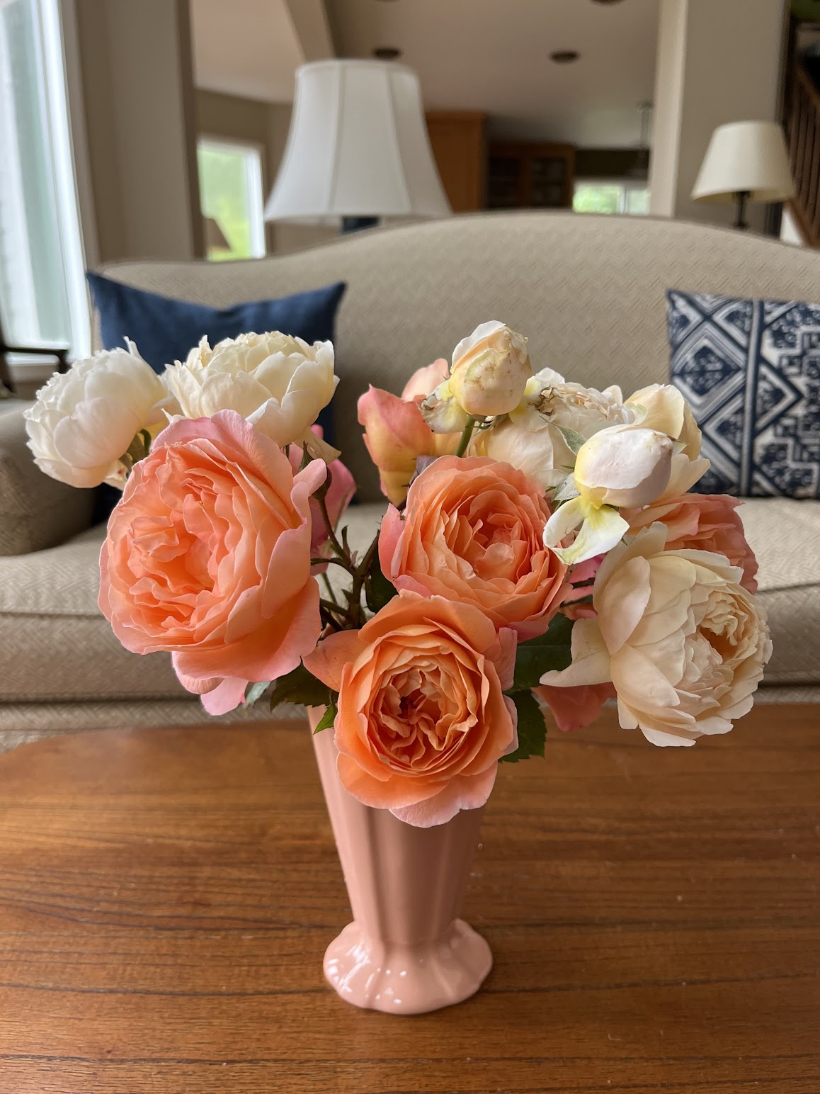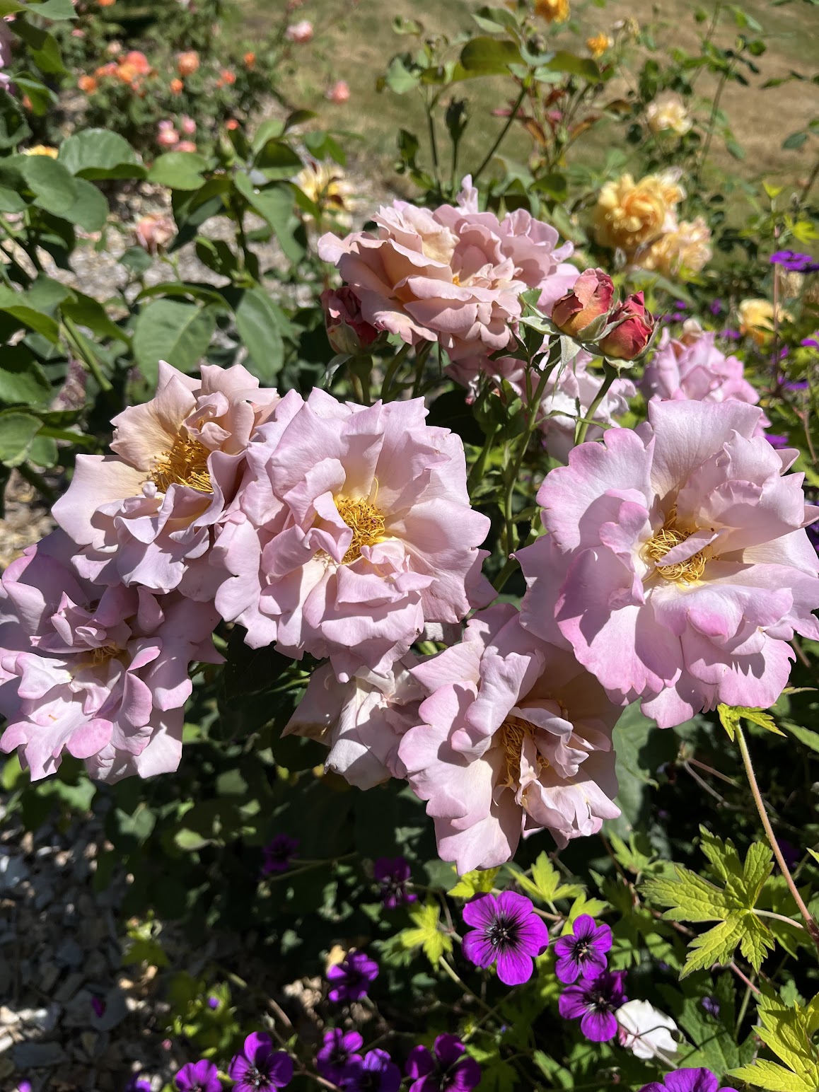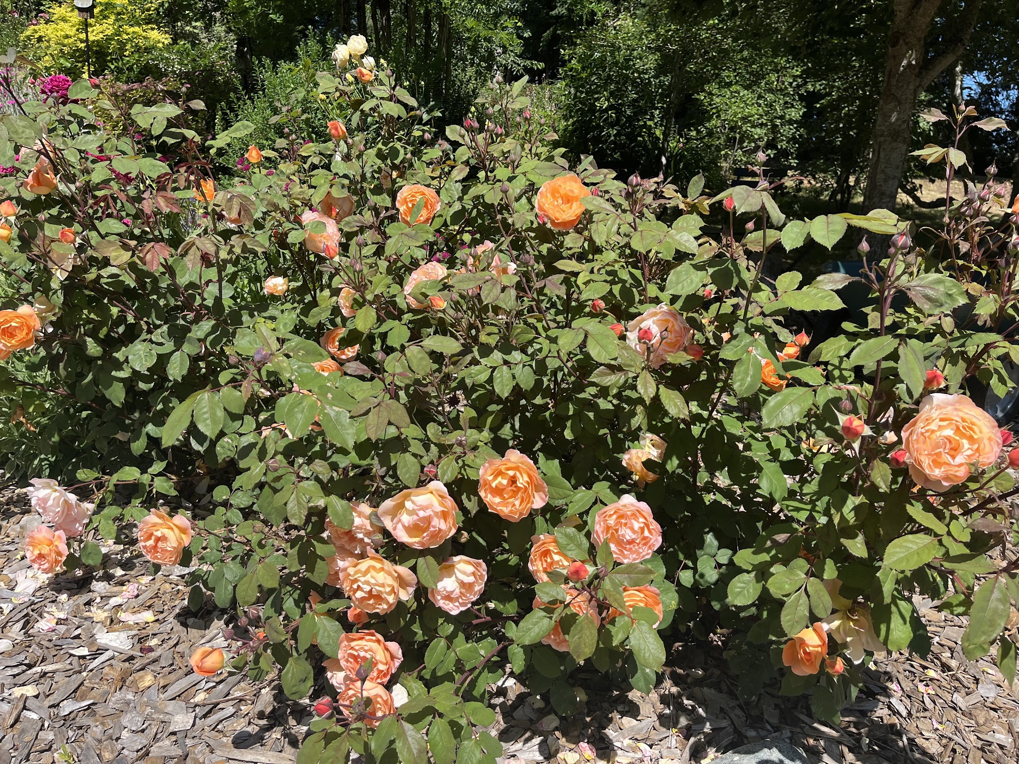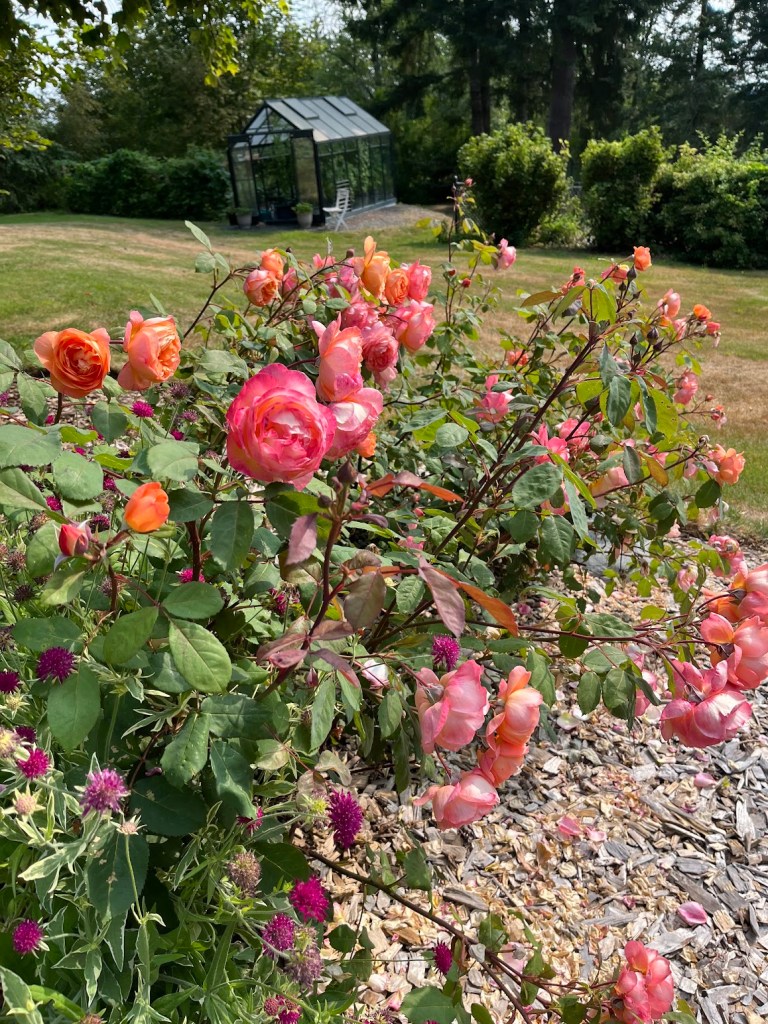 The rose garden is in its sixth year, with all 20 original roses flourishing. I’m continually making bouquets to bring indoors. In the designated rose garden, besides one Iceberg climber and 17 David Austin English rose bushes (of seven varieties), I grow two floribunda roses: Pumpkin Patch and Connie’s Sandstorm. Both are available in the U.S. but perhaps not elsewhere. Pumpkin Patch, shown in the first two photos below, is a gorgeous, dependable rose. Connie, in the last two photos, adds a bit of subtle brownish mauve to the garden. The two floribundas are practically thornless, a respite from some of my English roses (Gertrude Jekyll and Munstead Wood should come with warnings…)