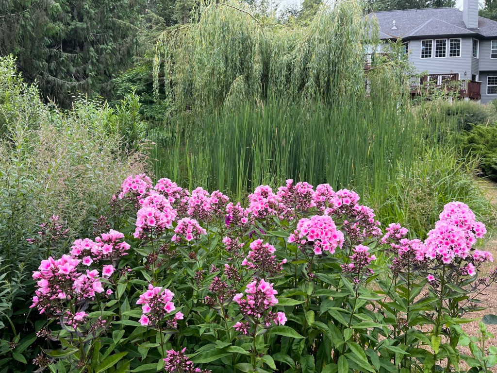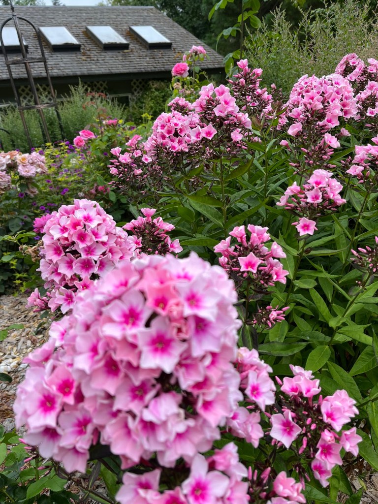 Before leaving the rose garden, I make a point of pausing along the edge to inhale the clove-like fragrance of hardy phlox ‘Bright Eyes’. This patch has expanded over the years to border the roses nicely.