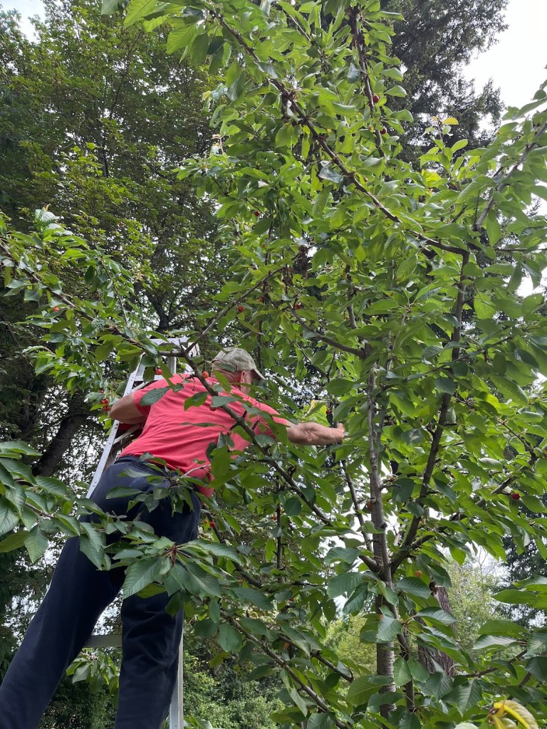 We’ve feasted on raspberries for weeks, and I’ve frozen close to 10 pounds for future delicious projects. The last two weeks have brought sweet cherries to our table. Well actually, Hubby has climbed the ladder and brought the cherries. These are Lapins cherries.