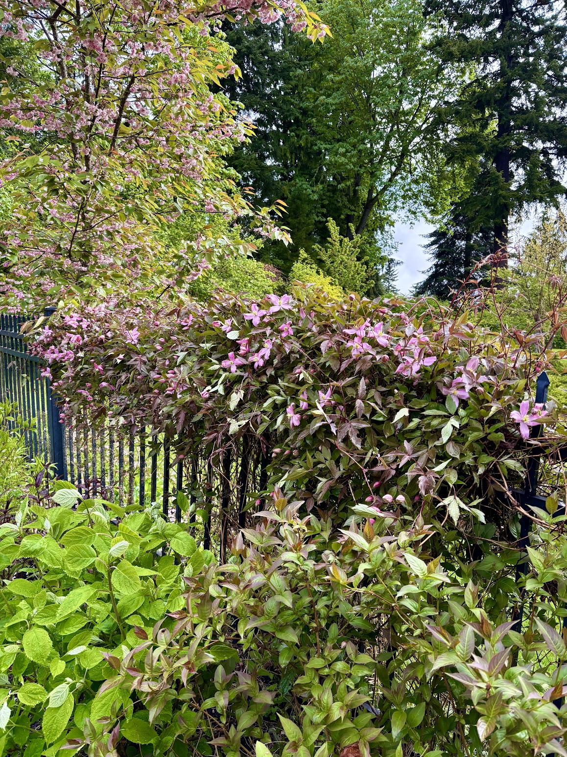 THREE – On to more pink. The first of the clematis parade have opened, and these two Montanas are some of my favorites in their lush simplicity. One is near our front entrance and another grows near the Kwanzan cherry.