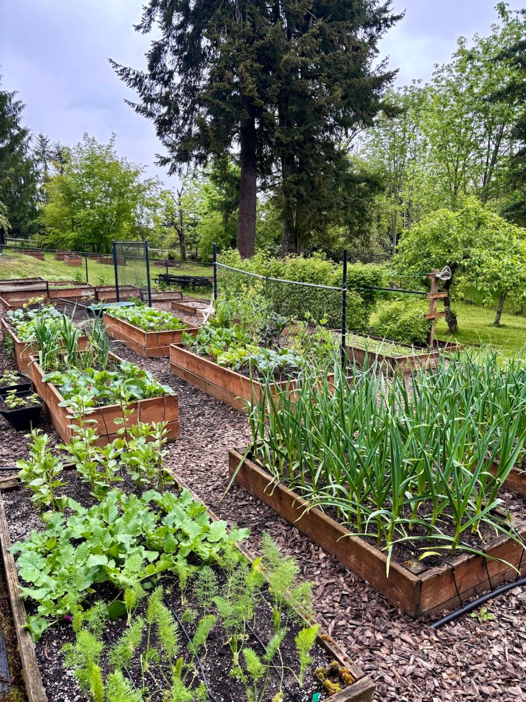 SIX – I’m relieved that all the veg garden beds are filled and flourishing. This year was the right time for a re-do of the 1/4-inch drip irrigation tubes; after eight years, many of the emitters were plugged.
